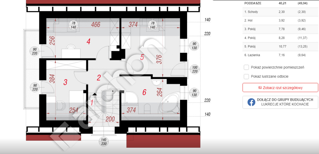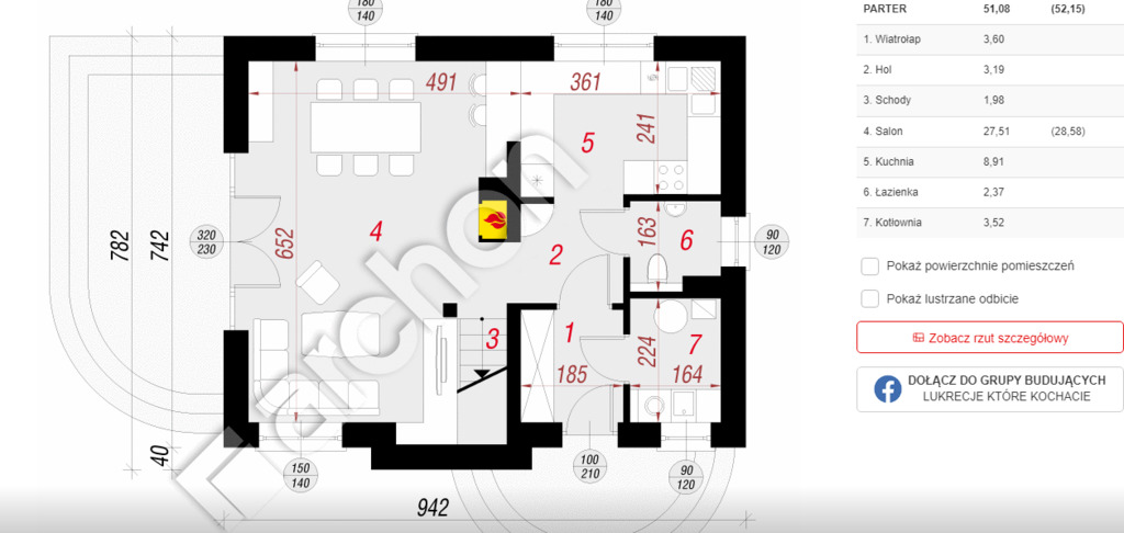 Szerokość budynku 9,42 m2, długość budynku 7,82 m2.
