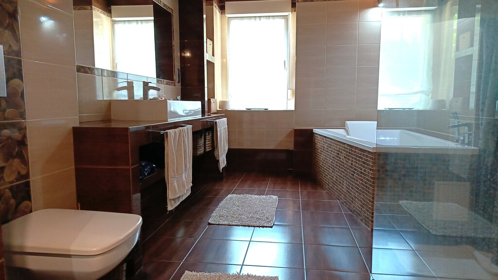 - Na ścianach gładzie, na podłogach w pokojach panele, w pozostałych pomieszczeniach płytki.