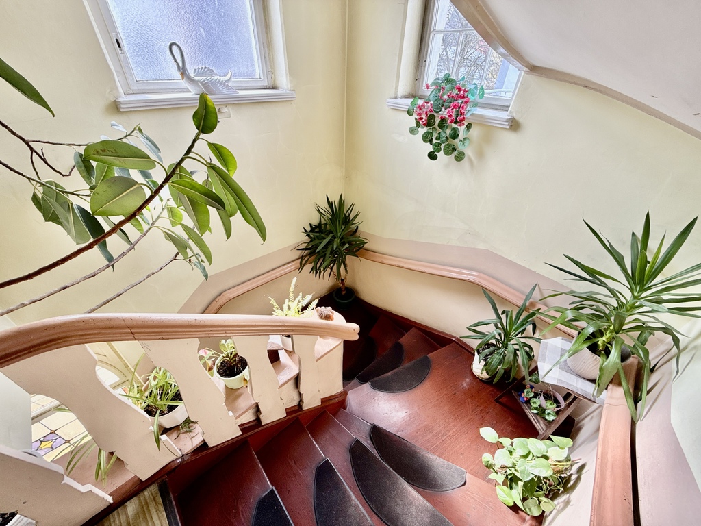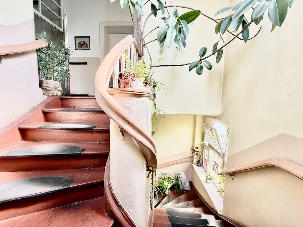 Wewnętrzna klatka schodowa prowadzi nas na pietra i strych. Klatka typowa dla starych kamienic, z kręconymi schodami oraz oknami.