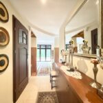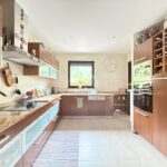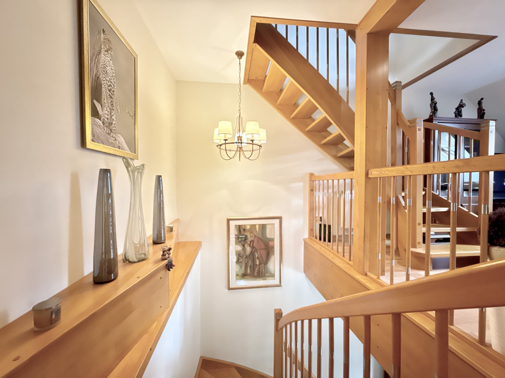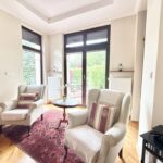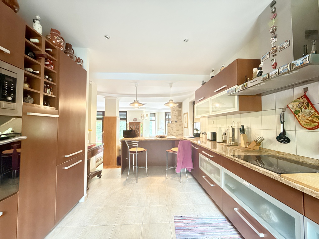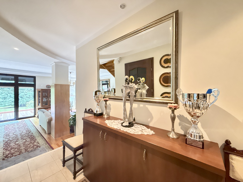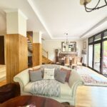 W pięknym i stylowym salonie z wyjściem na taras, mamy do dyspozycji kominek oraz widok na otwartą kuchnię- duża przestrzeń z otwartym planem. Dom utrzymany w klasycznym stylu z wieloma drewnianymi klasycznymi meblami.