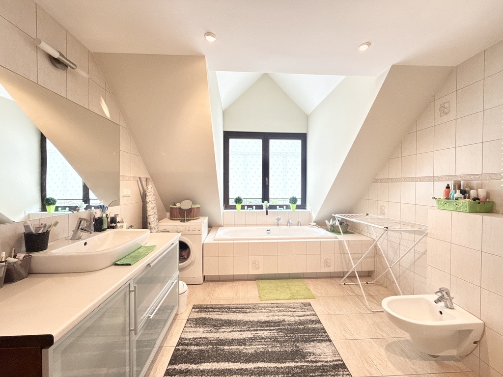 - pokój kąpielowy a w nim i wanna, i prysznic i dużo miejsca