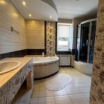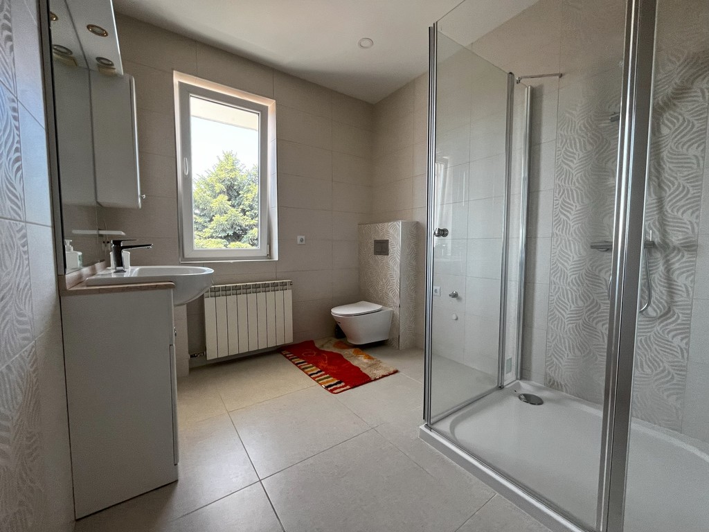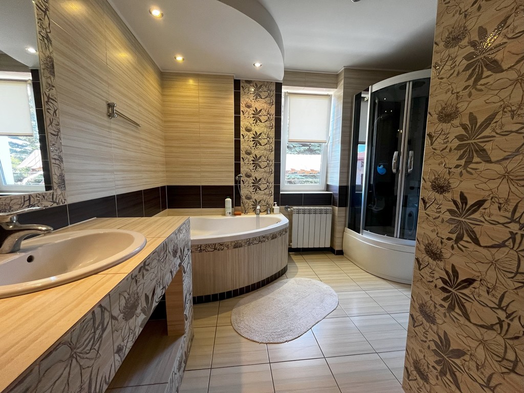 Dużą rodzinna łazienkę (9m2). Wyposażona w wannę i prysznic. Pomieszczenie niedawno przeszło całościowy remont, również wyposażono ją w armaturę dobrej jakości.