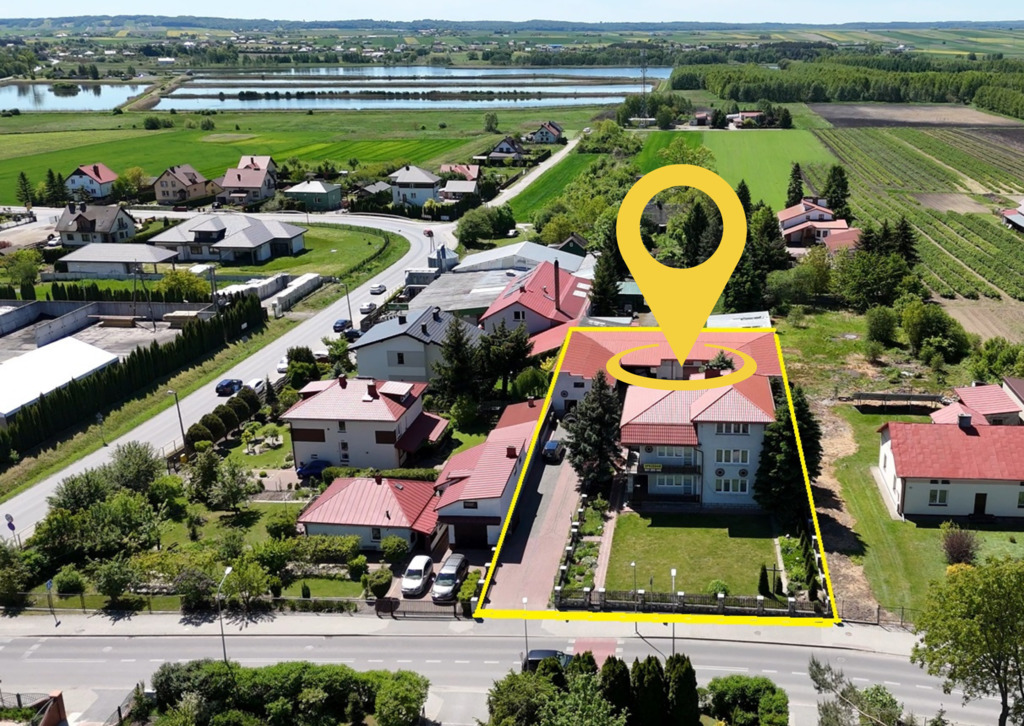 Nieruchomość zlokalizowana jest w centralnym punkcie Kalinowic, bezpośrednio przy trasie wyjazdowej z miasta.