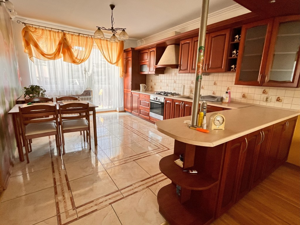 Kuchnię (15 m2) wyposażoną w drewniane meble w zabudowie oraz podstawowe sprzęty AGD. Z kuchni dostępne bezpośrednie wyjście na taras przez drzwi balkonowe.
