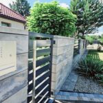 -Ogrodzenie betonowe w nowoczesnym stylu, podjazd i opaska wokół domu oraz ogrodu wybrukowana,