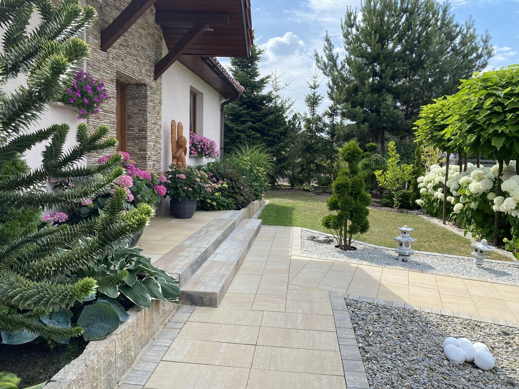 -Piękny zagospodarowany ogród z nawadnianiem kropelkowym roślin.