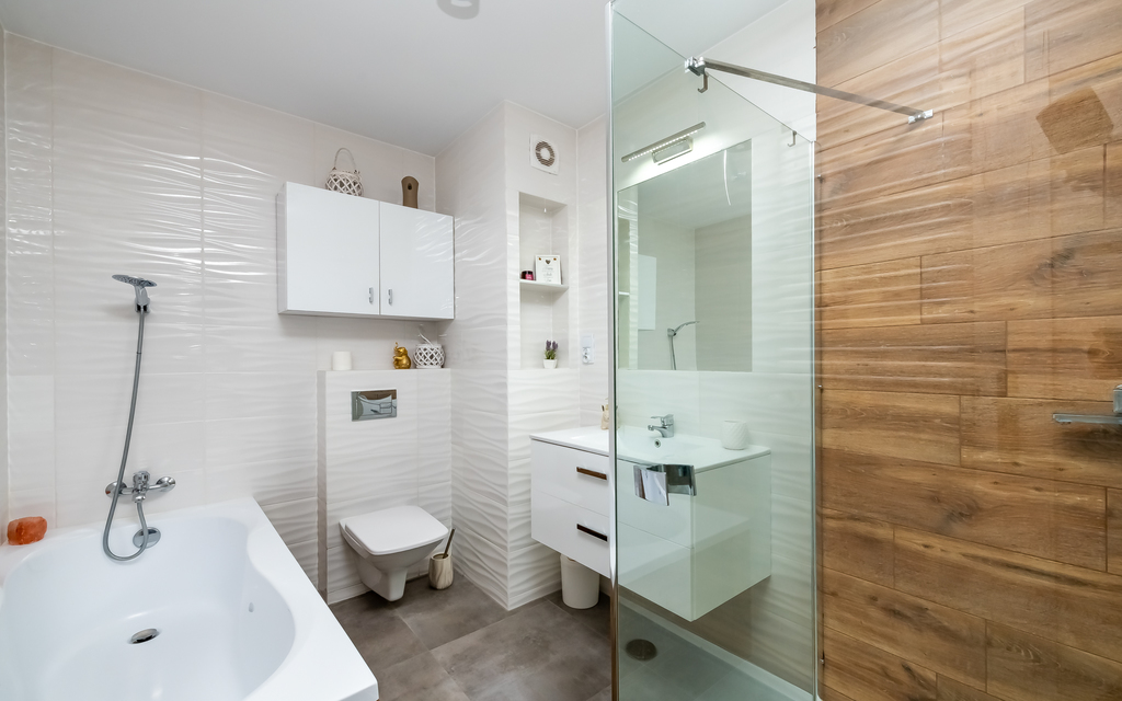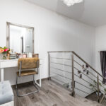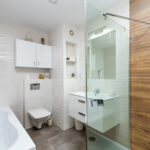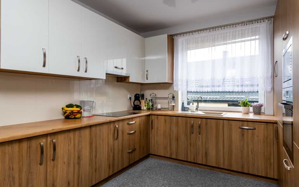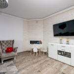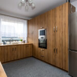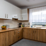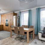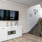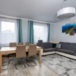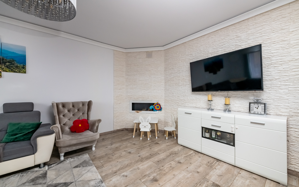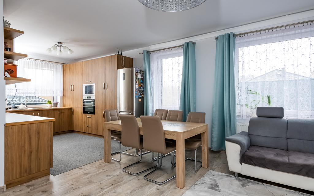 - Parter o powierzchni 41,4 m² oferuje przestronny salon połączony z nowoczesną kuchnią wyposażoną w stałą zabudowę. To miejsce, gdzie domownicy mogą spędzać wspólne chwile, ciesząc się komfortem i wygodą.