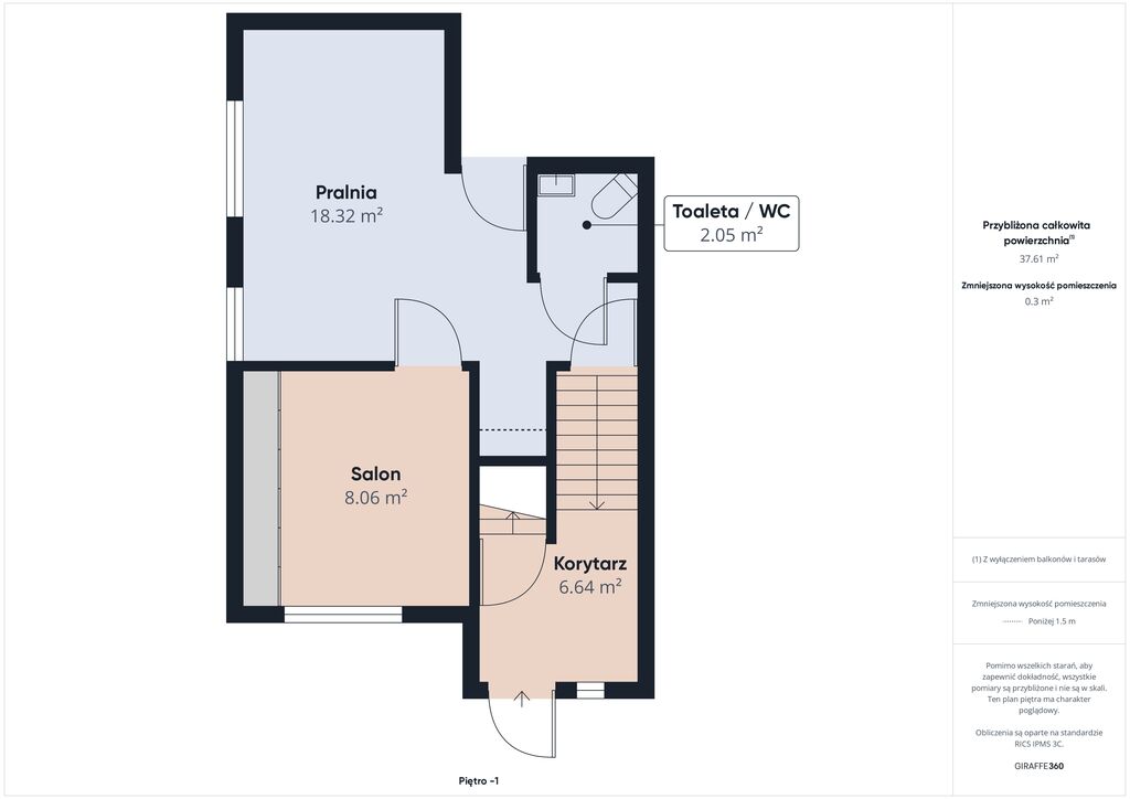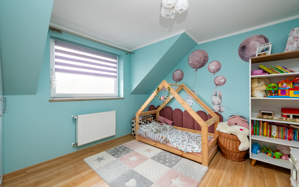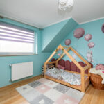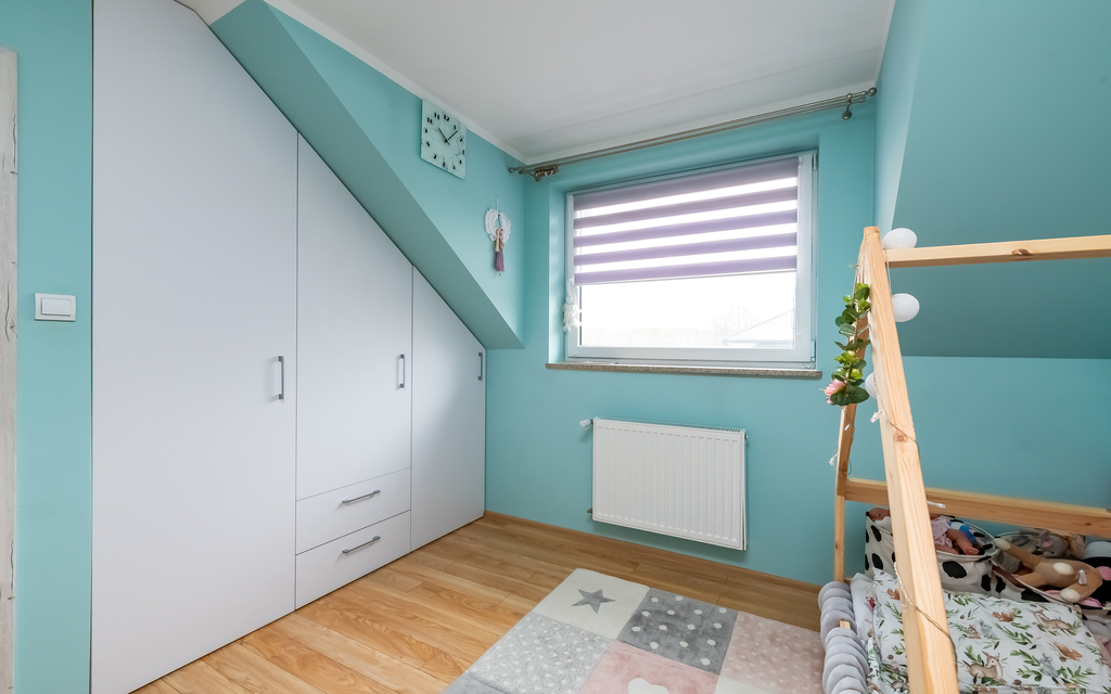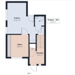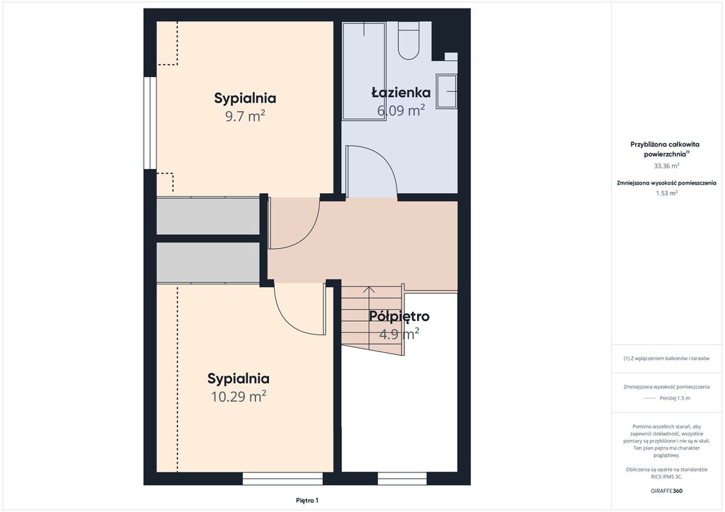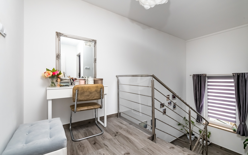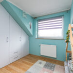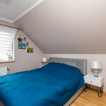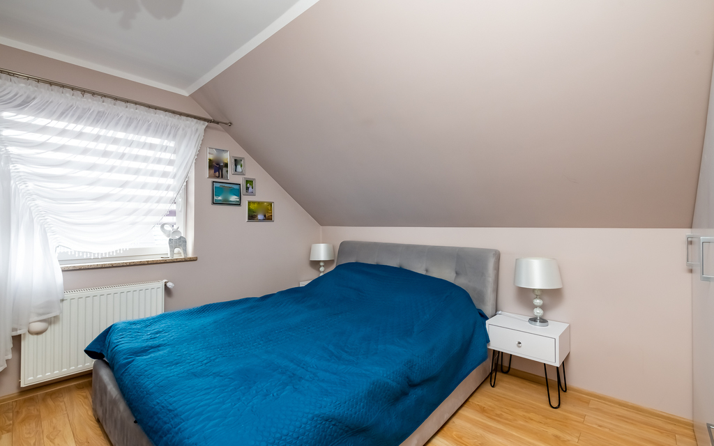 - Na piętrze, o powierzchni 35,08 m², znajdują się dwie oddzielne, jasne sypialnie oraz funkcjonalna łazienka. Dodatkowo, na tym poziomie umieszczone jest wejście na wysokie poddasze, które służy jako praktyczny składzik.