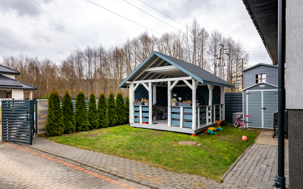 Dom wyposażony jest w nowoczesny piec na pellet, zapewniający efektywne ogrzewanie. Dom podłączony do wodociągu gminnego, sieć kanalizacyjna w trakcie realizacji. Na terenie posesji znajduje się ogrodzona działka o powierzchni około 193 m², na której umieszczono dużą drewnianą altanę oraz praktyczną szopę na narzędzia. Działka płaska, ogrodzona.