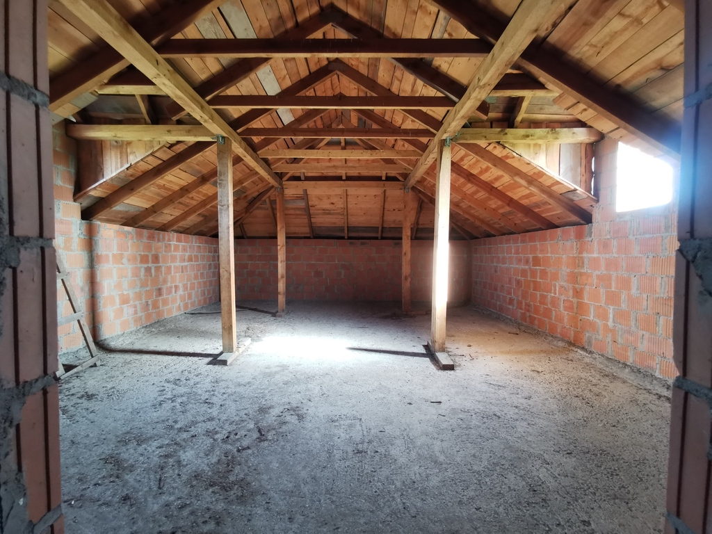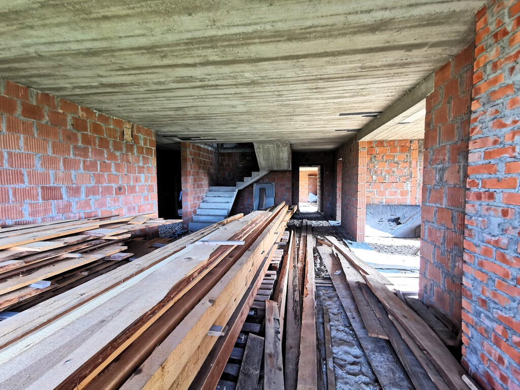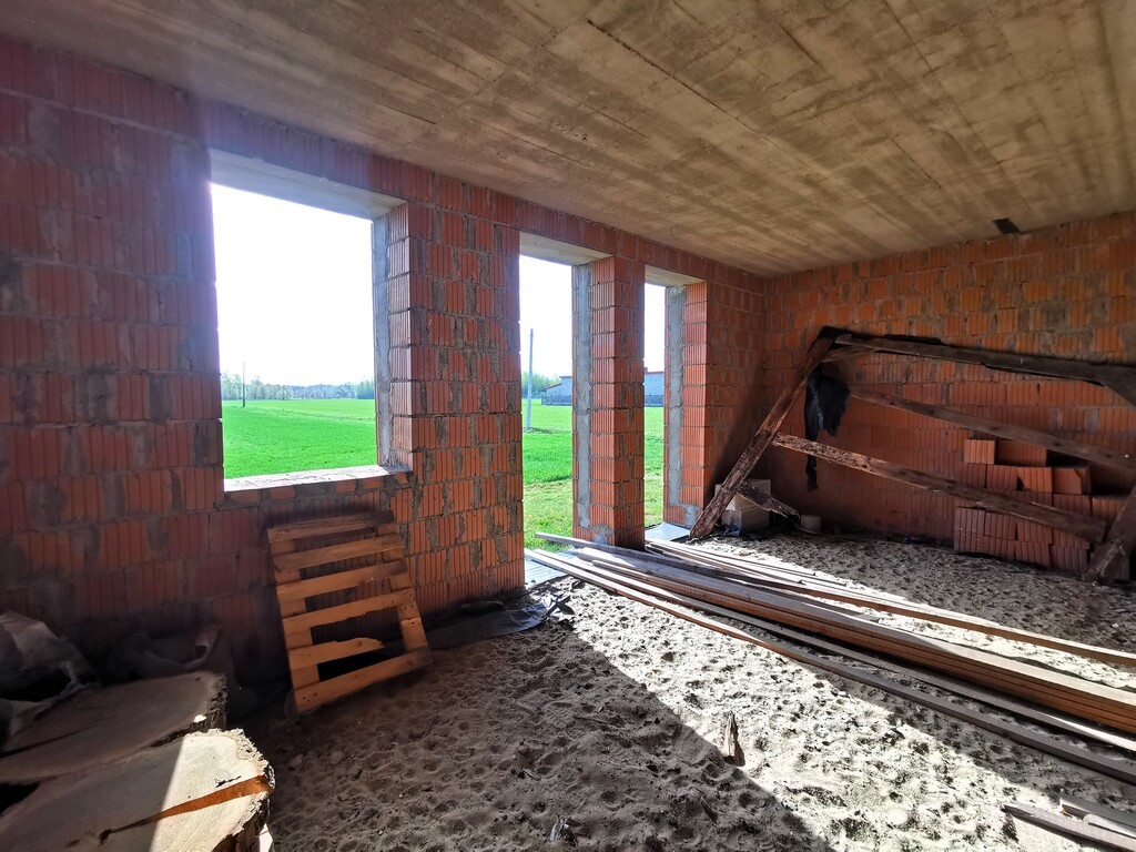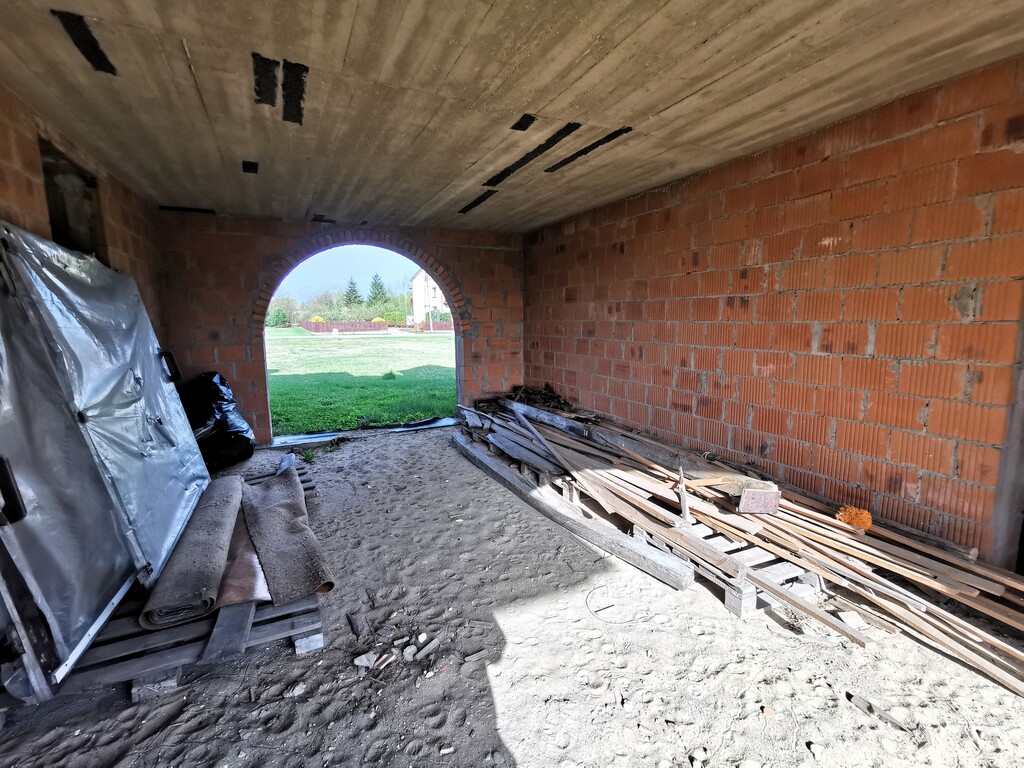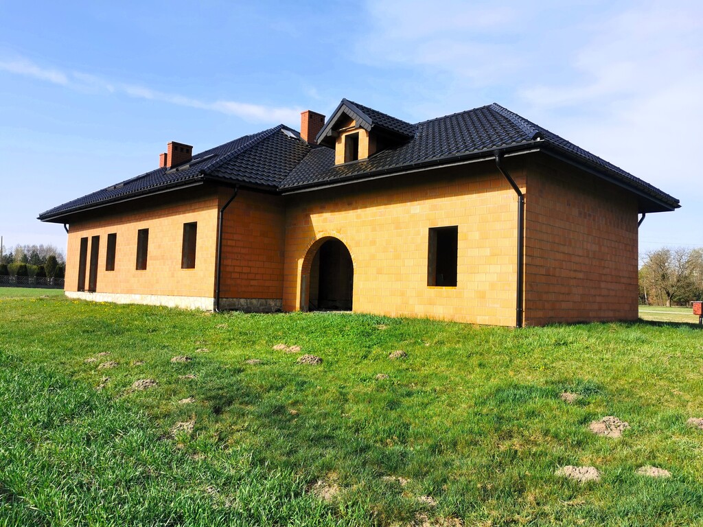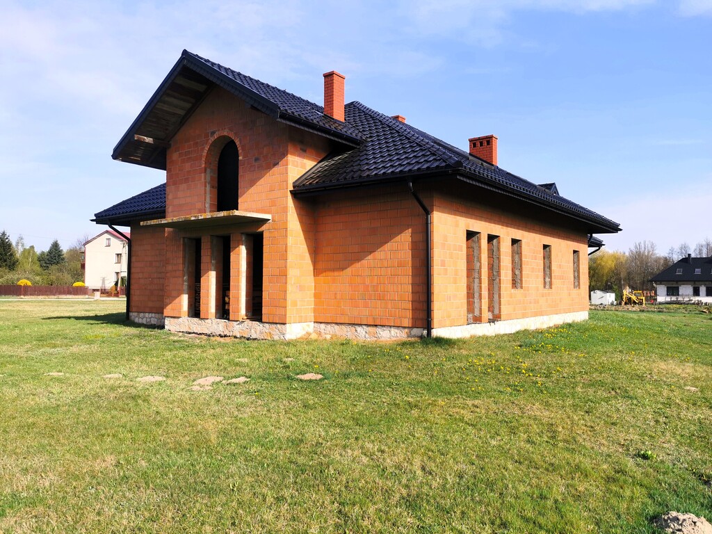 Aktualny etap budowy to stan surowy otwarty z dachem. Woda i prąd wciągnięte są na nieruchomość. Brak rozprowadzonej instalacji hydraulicznej i instalacji elektrycznej. Materiał budowy pustak ceramiczny (1,5 pustaka z mostkiem termicznym wypełnionym 10cm styropianem). Zgodnie z projektem, dom zajmować ma powierzchnię 378,71m2. Wybudowany został z dbałością o szczegóły z materiałów o najwyższej jakości.