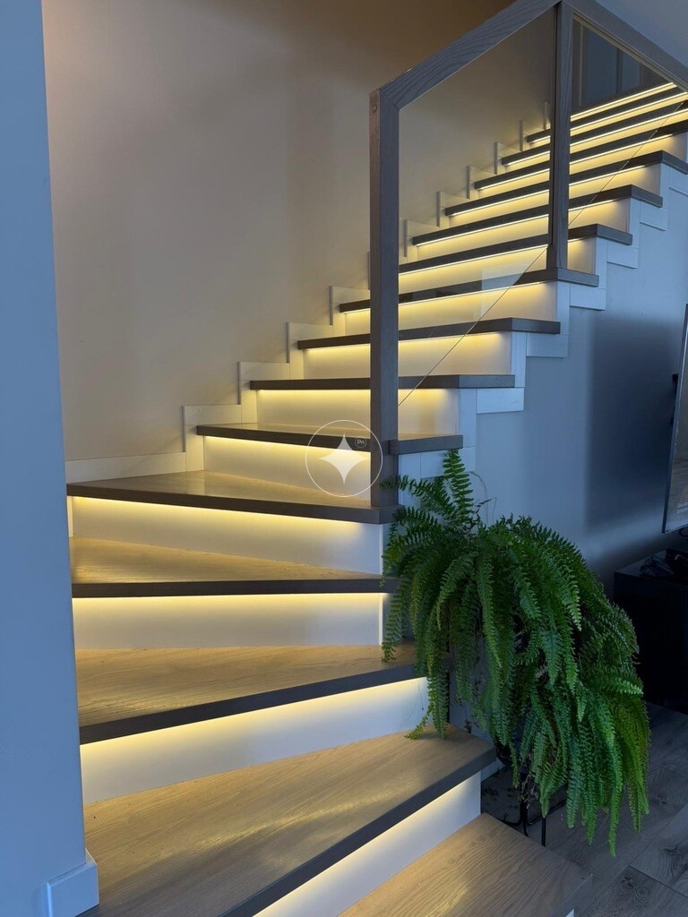 - schody z drewna jesionowego, lakierowane ( nie wymagające olejowania) klimatycznie oświetlone.