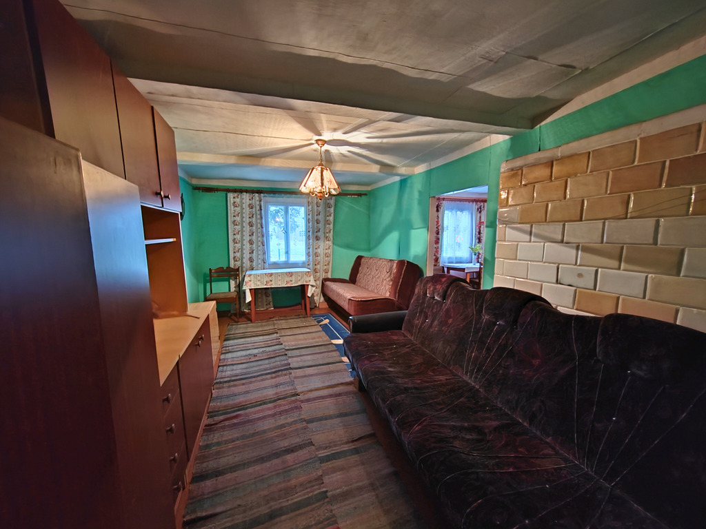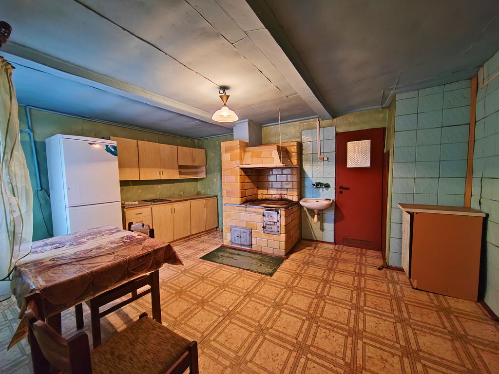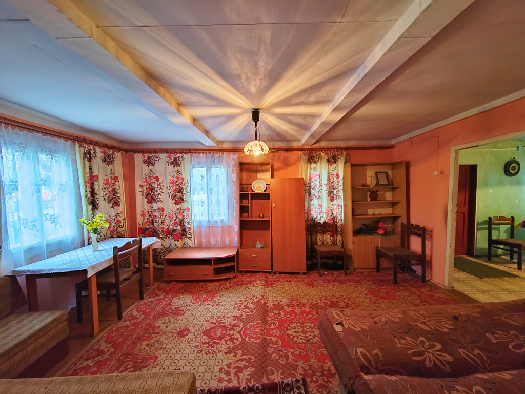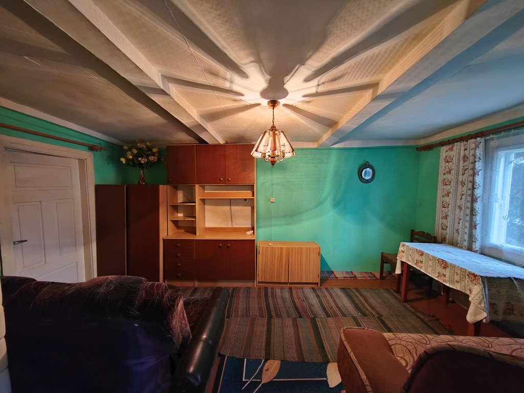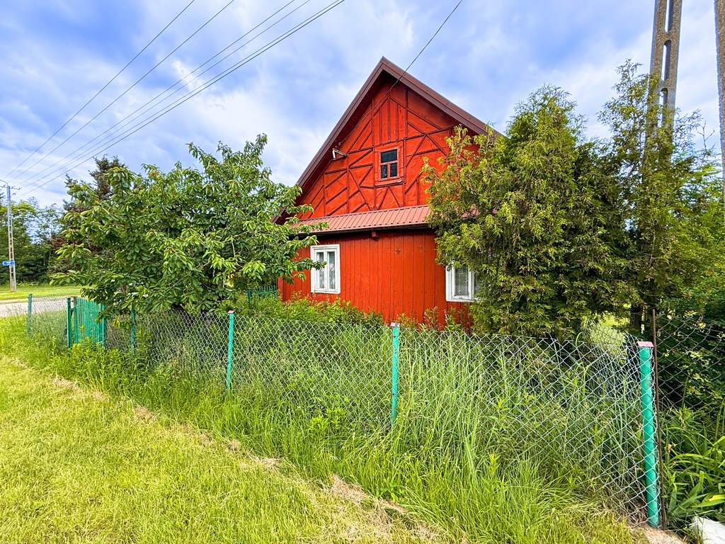 - Dom: z 1950 roku, drewniany, blaszany dach, pow. użytkowa 91 m²