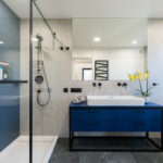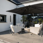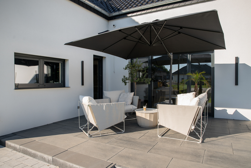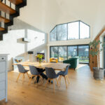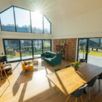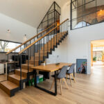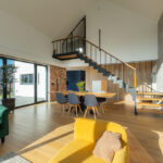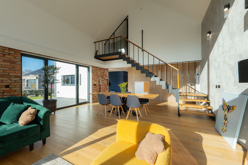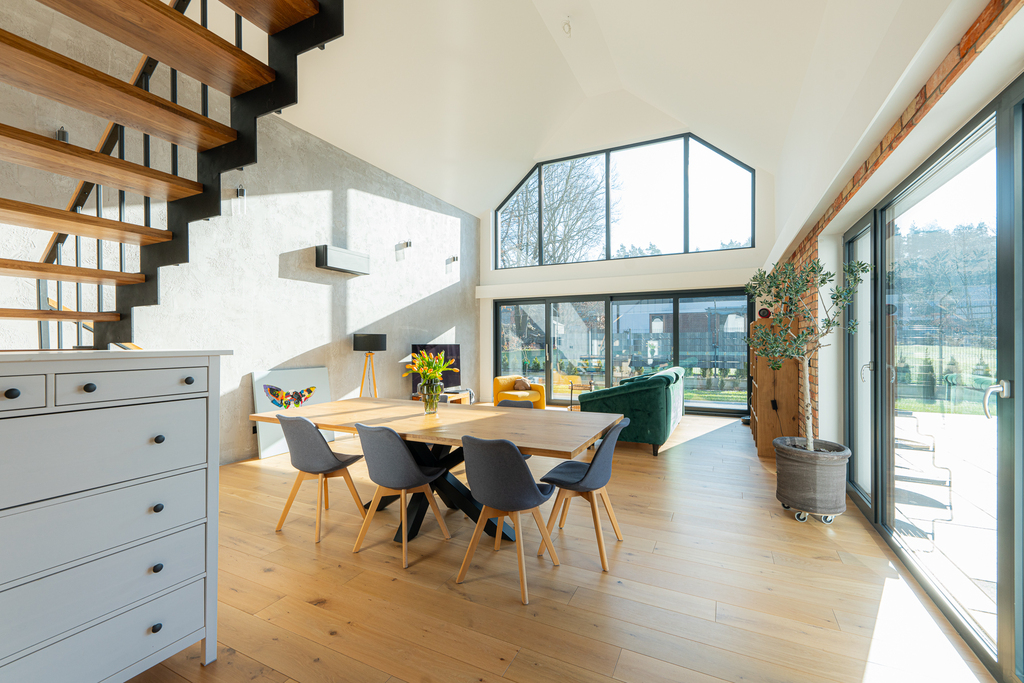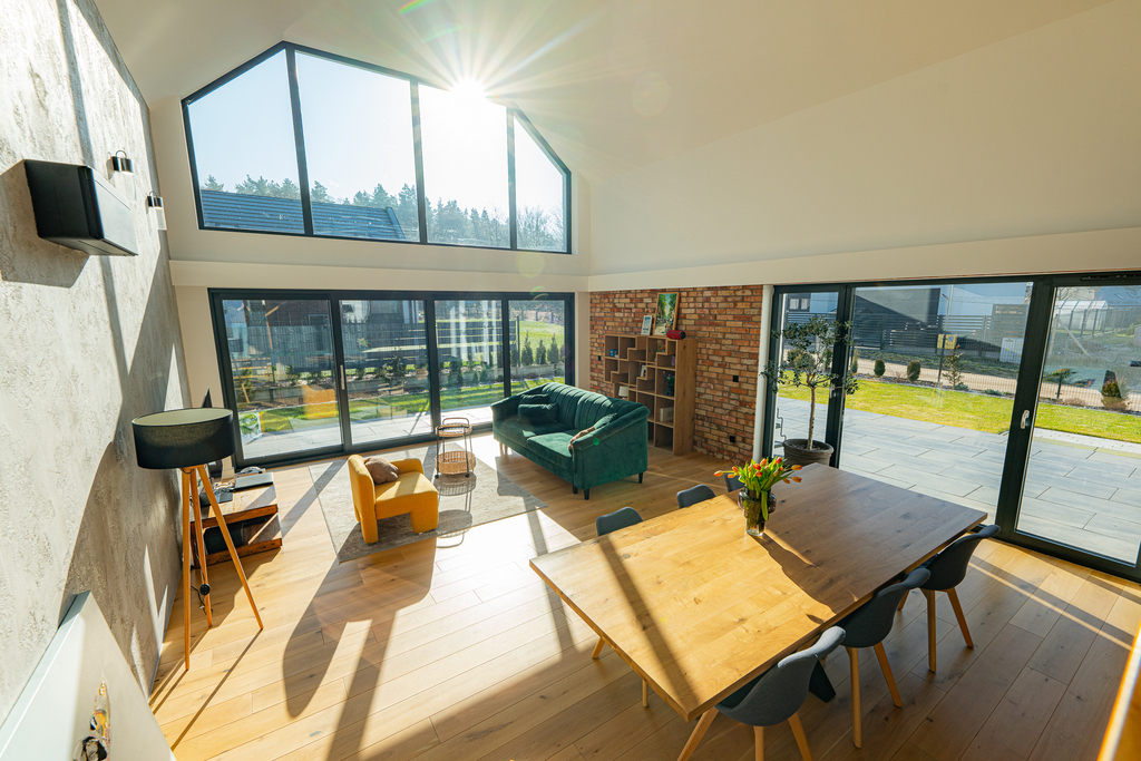 • Salon 47,5 m² – wysoki sufit (6 m w szczycie!), ogromna witryna, taras okna HS