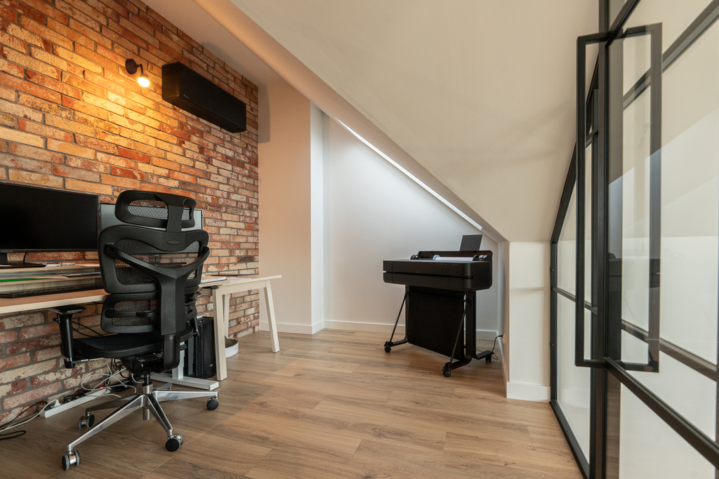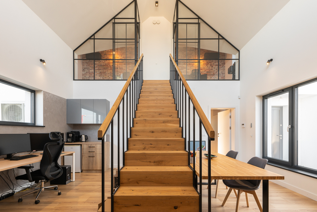 • Piętro: 2 jasne gabinety ze szklaną zabudową loftową