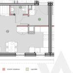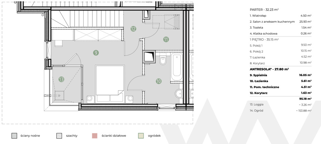- Antresola (27,8 m²): sypialnia (16 m²), łazienka, pomieszczenie techniczne, loggia.