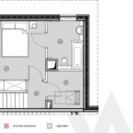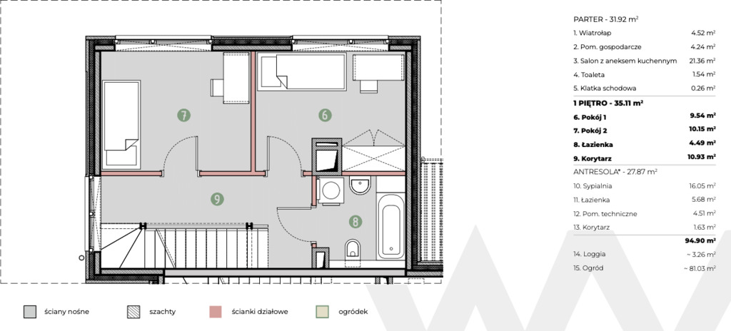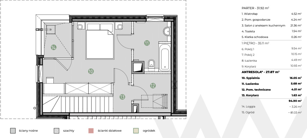 - Antresola (27,9 m²): sypialnia (16 m²), łazienka, pomieszczenie techniczne, loggia.