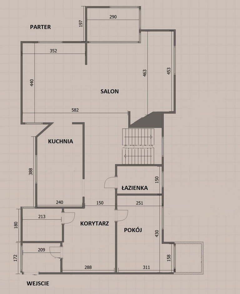 Parter: Przestronny salon z aneksem kuchennym, zapewniający dużą ilość naturalnego światła oraz wyjście na ogród zimowy, znajduje się tu osobny pokój -gabinet oraz łazienka, z przystosowaniem dla osoby niepełnosprawnej ,garderoba oraz wbudowana szafa wnękowa.
