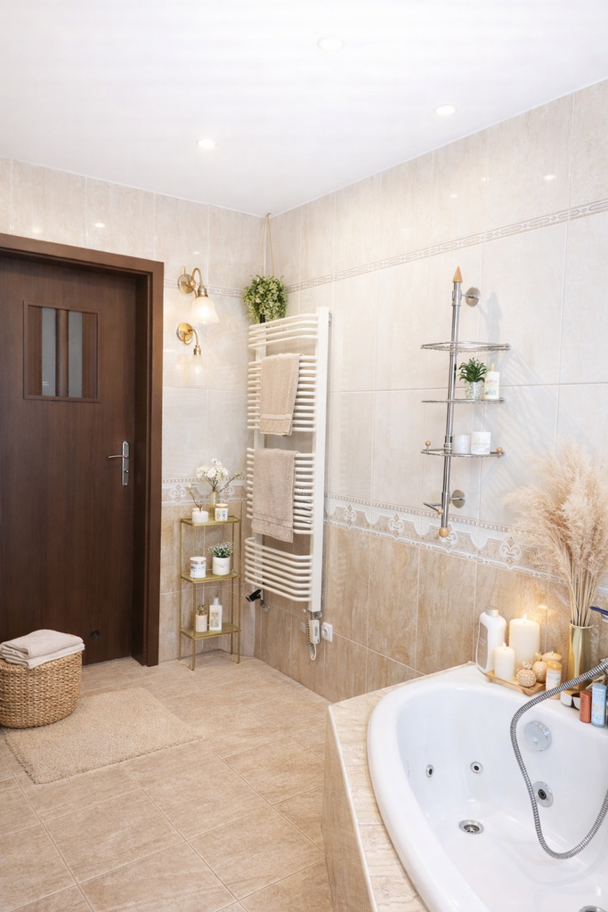 Łazienka została wyposażona zarówno w narożną wannę, jak i prysznic – wygodne rozwiązanie dla całej rodziny.