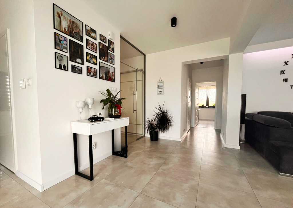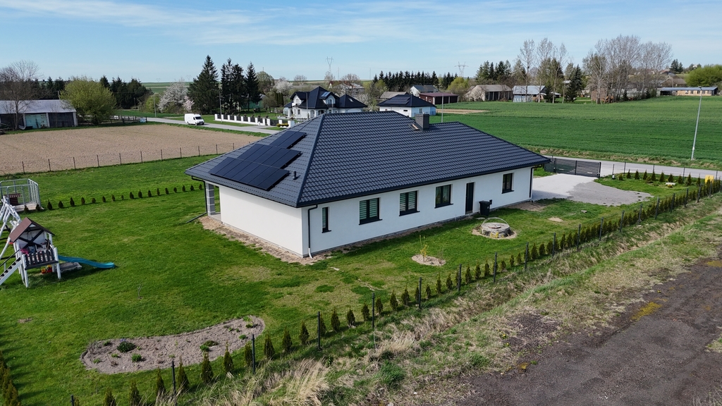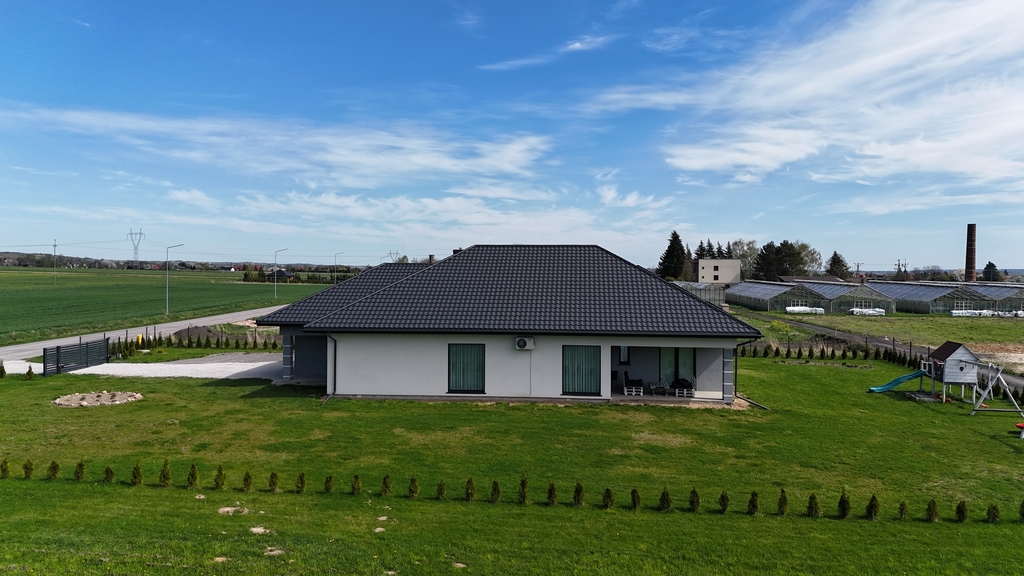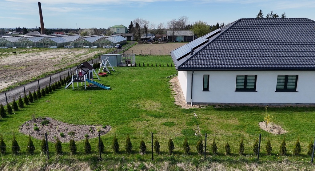 Nieruchomość jest w całości zaprojektowana w sposób funkcjonalny, z zastosowaniem nowoczesnych i  praktycznych rozwiązań. Każde miejsce w domu jest wykorzystane i urządzone w sposób przemyślany. Reprezentacyjne przestrzenie - salon, kuchnia oraz łazienki zaprojektowane są w funkcjonalny sposób, wykończone z użyciem wysokiej jakości materiałów, w neutralnych kolorach, nowoczesnym stylu wpasowującym się w obecne trendy  Udogodnienia takie jak klimatyzacja, ogrzewanie gazowe podnoszą komfort mieszkania a instalacja fotowoltaiczna obniża koszty eksploatacyjne. Otoczenie domu jest zadbane, podjazd do garażu i miejsca parkingowe zewnętrzne utwardzono, założono trawnik, rabaty kwiatowe i plac zabaw. Granice działki obsadzono tujami. Dom nie wymaga żadnych nakładów finansowych.