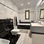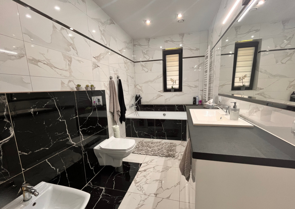 •   Rodzinnej łazienki z wanną. Obie dostępne w domu toalety wykończono w nowoczesnym stylu z wykorzystaniem sprzętów i materiałów wysokiej jakości.
