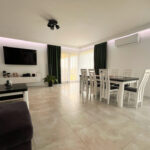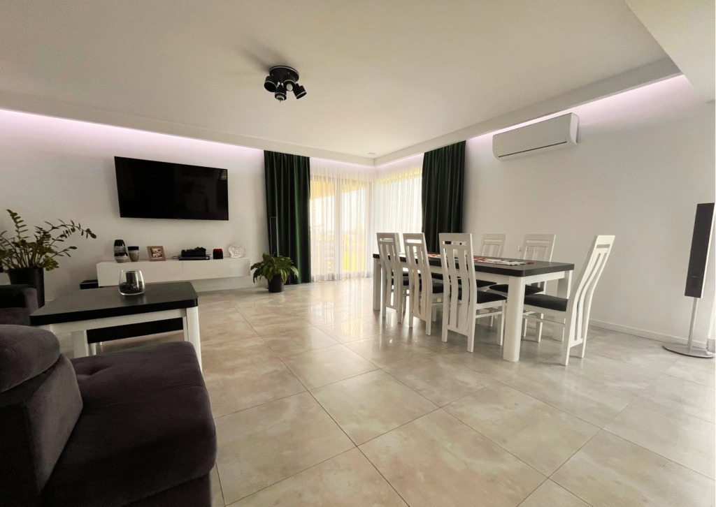 •    Klimatyzowany salon z częścią wypoczynkową – kanapą i telewizorem. Bezpośrednio z salonu możliwe jest przejście do kuchni oraz na taras. Pomieszczenie jest bardzo jasne, przestronne.