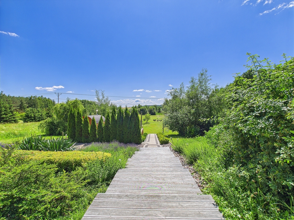 Działka o pow. 3 500 m2, częściowo ogrodzona jest pięknie zagospodarowana różnorodną roślinnością.