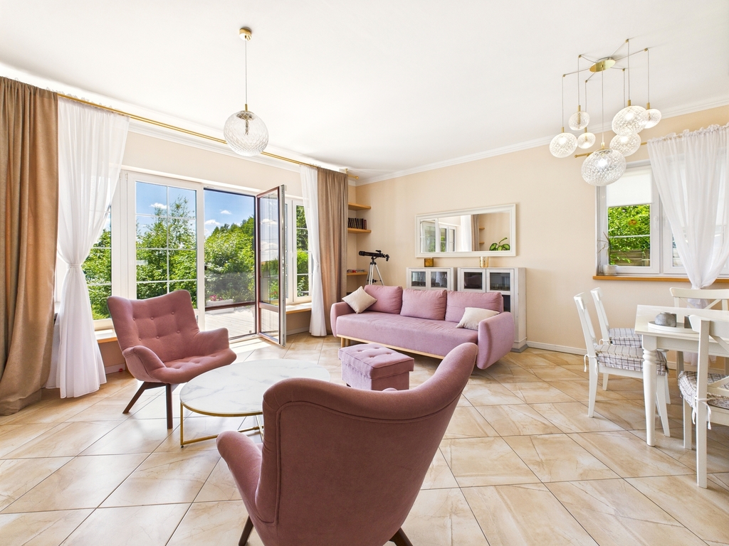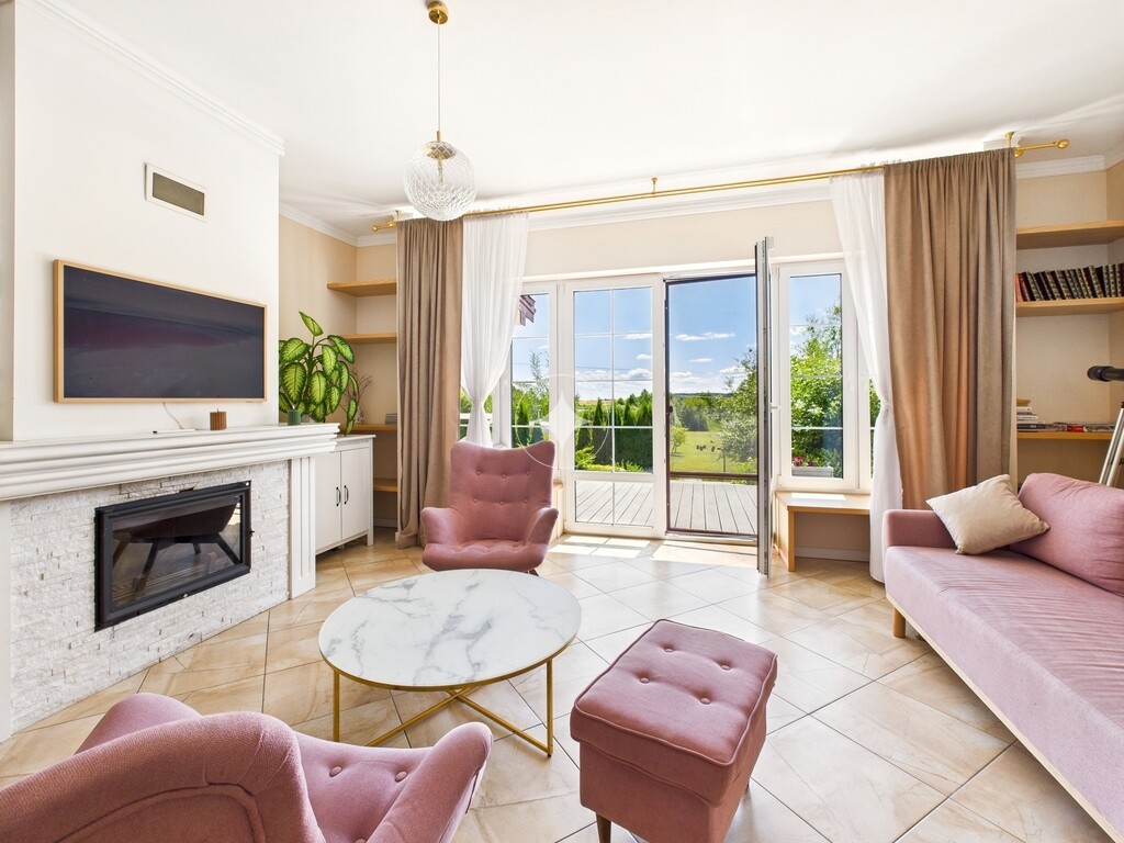 - salon z kominkiem oraz wyjściem na taras z pięknym widokiem na ogród i jezioro