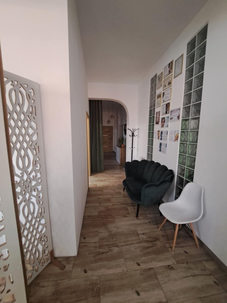 Funkcjonalny układ pomieszczeń: w części mieszkalnej znajdują się duży salon z wyjściem na balkon, sypialnia, 2 pokój dziecięcych, kuchnia, Łazienka + wc, w części użytkowej: recepcja, łazienka, 4 pokoje zabiegowe, pomieszczenie socjalne, strefa SPA: sauna fińska, sauna infrared, Jacuzzi USSPA, małą grota solna, szatnia, łazienka.