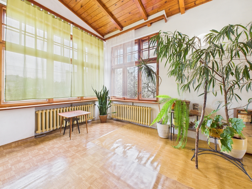 Okna (drewniane) wychodzą z domu na wszystkie strony świata, z salonu jest dodatkowe wyjście na taras i ogród.