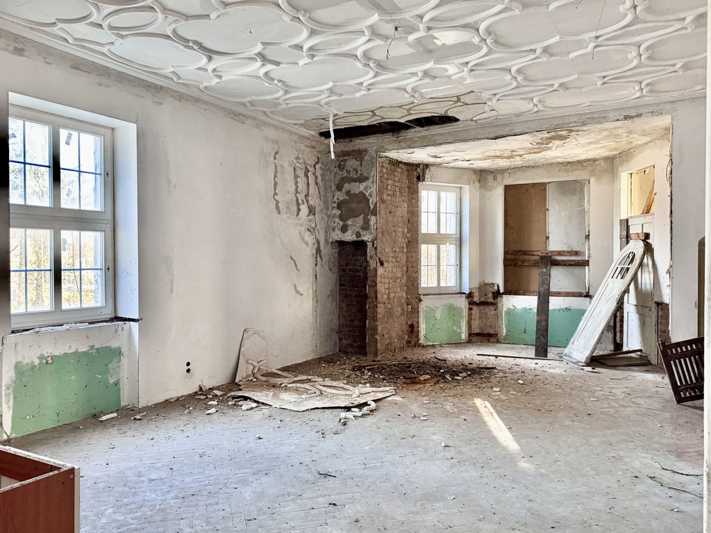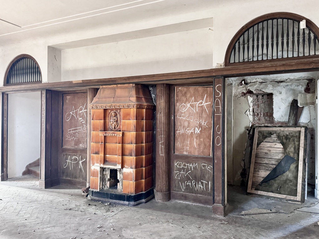 - Oryginalne wnętrza zachowane w dużej części – boazerie, piece kaflowe, stiukowe sufity i unikalne detale architektoniczne.