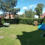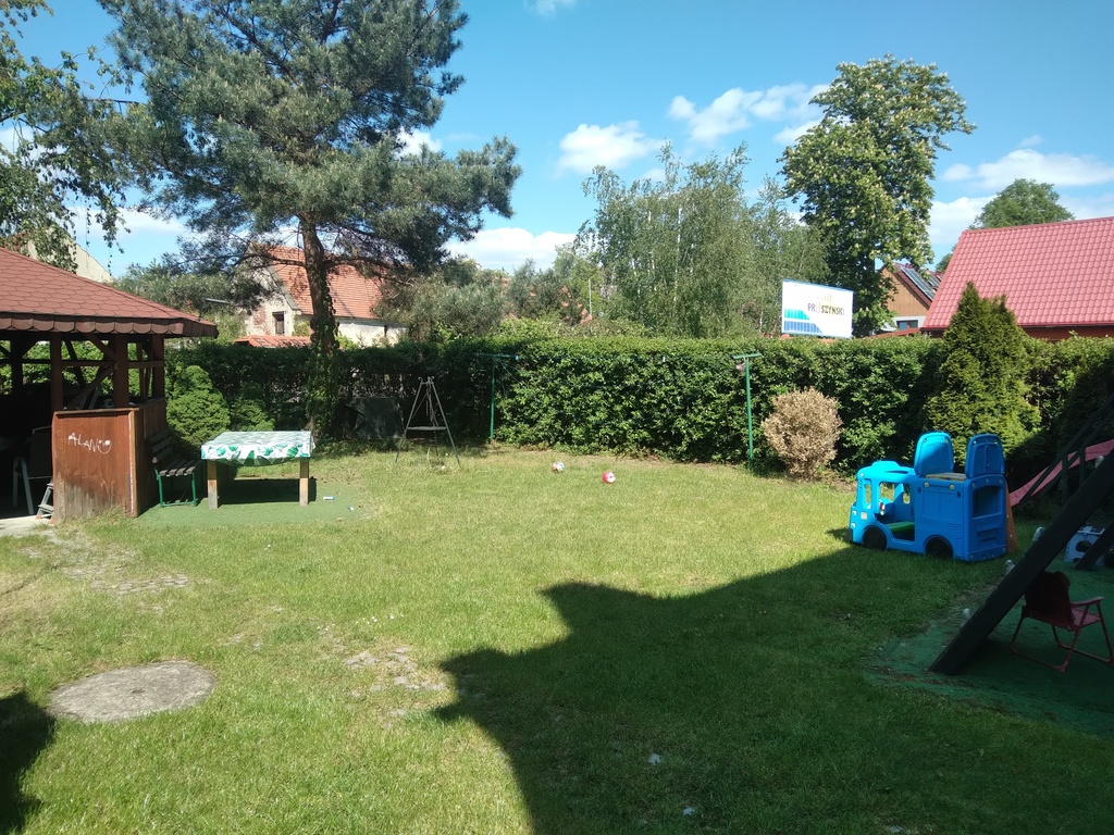Ogród jest ładnie zagospodarowany, słoneczny z altaną.
