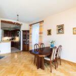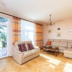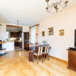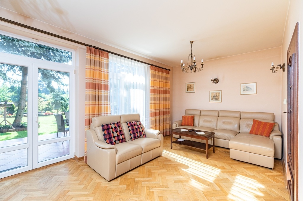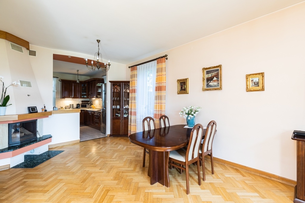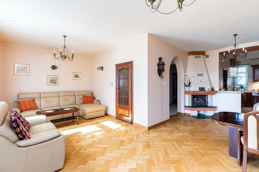 - salon o pow. 47,1 m2; przestrzenny i bardzo dobrze doświetlony, z dwoma podwójnymi parami drzwi prowadzącymi na taras i ogród; z narożnym kominkiem opalanym drewnem; w salonie duży stół (po rozłożeniu 4,5 m długości, nawet dla 18 osób) oraz komplet skórzany sofa i narożnik marki Kler (wymienione ok. 4 lata temu). Na podłodze parkiet dębowy.