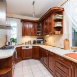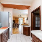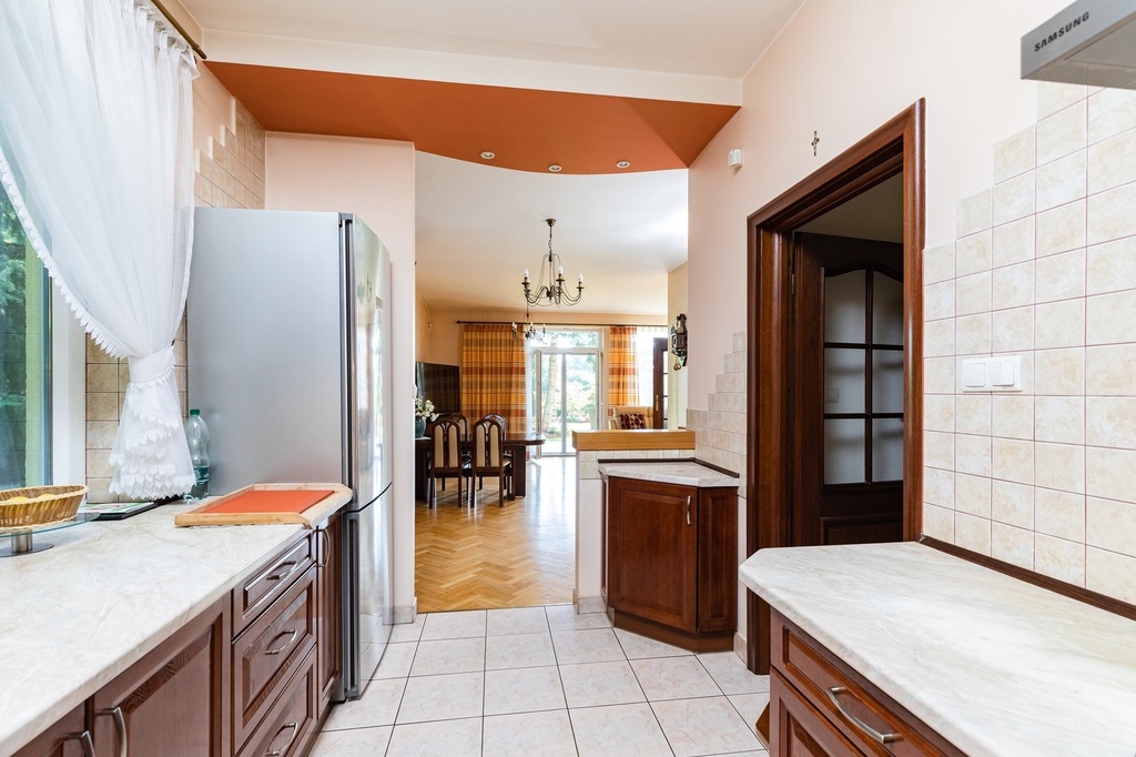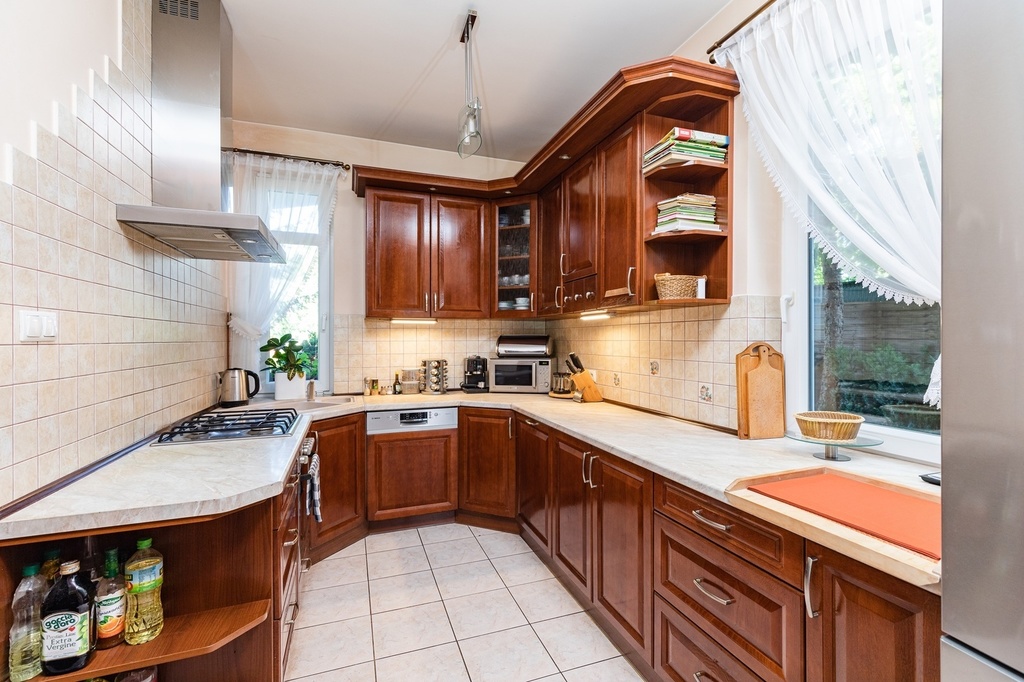 - kuchnia o pow. ok. 9,5 m2, podgrzewana podłoga wyłożona płytkami, meble kuchenne na wymiar z frontami drewnianymi dębowymi; piekarnik elektryczny marki Bosch; płyta gazowa marki Bosch; zmywarka marki Bosch (wymieniona ok. 3 lata temu), bardzo duży i mocny okap marki Samsung (ok. 4 lata), lodówka marki Bosch (ok. 5 lat). Dwa okna w kuchni wychodzące na północ i zachód (w kierunku bramy wjazdowej na posesję); kuchnia otwarta na salon.