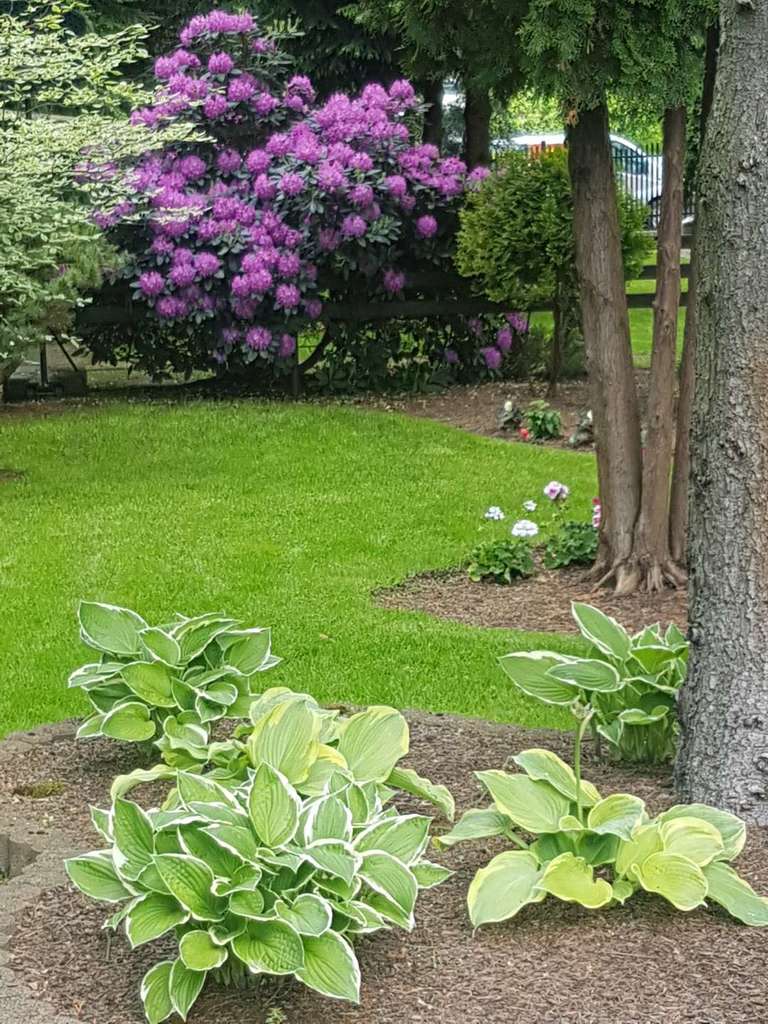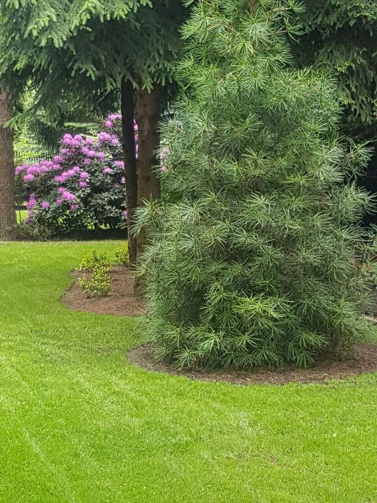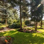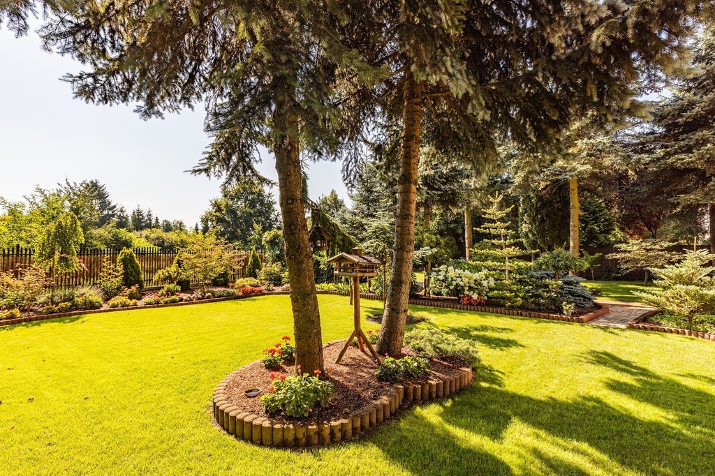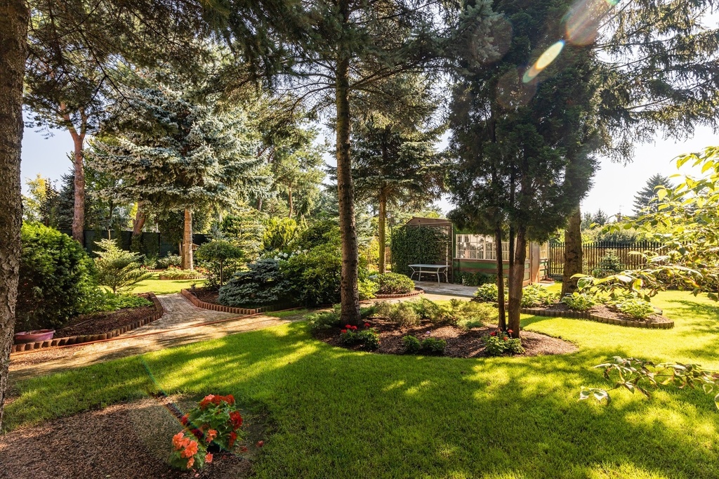 Niewątpliwym atutem tej nieruchomości jest piękny ogród – starannie zaplanowany i zadbany. Można odnieść wrażenie, że jest to ogród botaniczny. Rosną tu sosny (pospolita, czarna, wejmutka, limba), świerki (pospolity, niebieski), jodła (koreańska, lokówka), a nawet piękna 3 metrowa sośnica japońska stanowiąca osobliwość o wartości kolekcjonerskiej. Swoje miejsce znalazły też buki, klony i dąb, który jesienią przebarwia liście na czerwony kolor. Rosną tu także brzozy, graby, żywotniki, cyprysik. Wiosną kwitnie magnolia, różaneczniki (jest ich osiem), azalie, tulipany, irysy oraz peonie w kolorach różowym, czerwonym, białym i żółtym. Latem kolorytu dodają róże, clematisy, pelargonie, begonie, funkie oraz żurawki. Ozdobą ogrodu są hortensje – ogrodowa, bukietowa oraz pnąca.