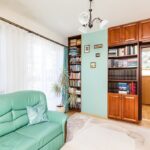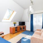 - sypialnia o pow. 13,6 m2 z ekspozycją zachodnią, z wyjściem na duży półokrągły balkon; duże okno dachowe z roletą, zabudowa typu regał na wymiar, skórzana sofa rozkładana, podłoga dębowa. Z sypialni wejście do garderoby o pow. 8,4 m2.