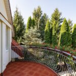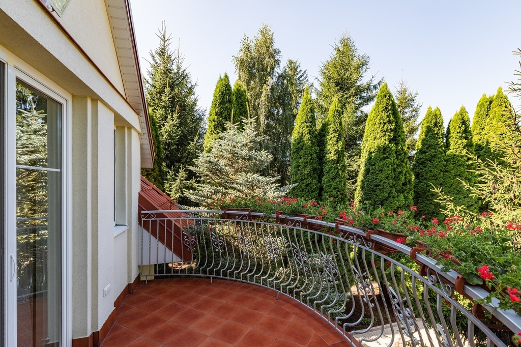 Brama wjazdowa na posesję otwierana automatycznie. Na podjeździe kostka brukowa, miejsce na dwa duże samochody. Nad wejściem do domu znajduje się balkon stanowiący zadaszenie.