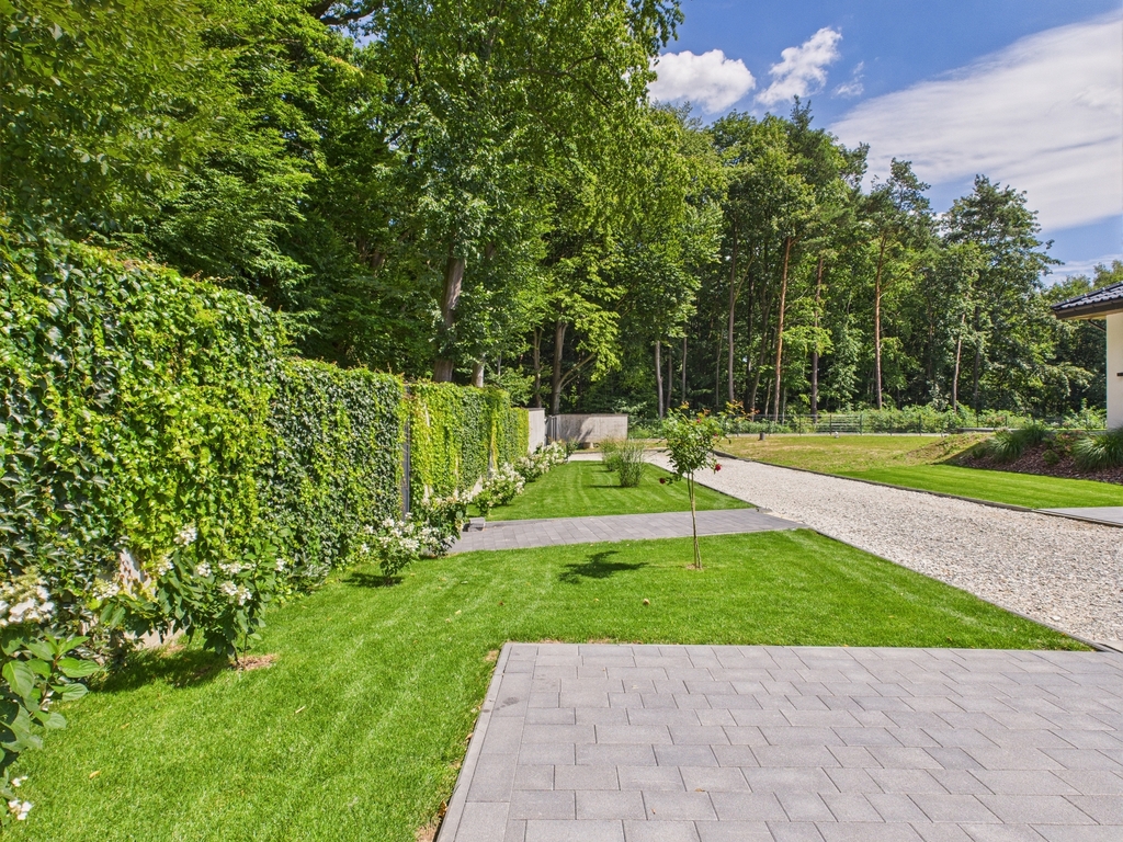 Część działki jest zagospodarowana i tworzy piękny ogród wraz z tarasem, pozostałą jej część pozostawiono do indywidualnego projektu, nowego właściciela gdyż, co może być pożądaną opcją - idealnie nadaje się na wybudowanie basenu, który będzie sąsiadował z samą granica lasu.