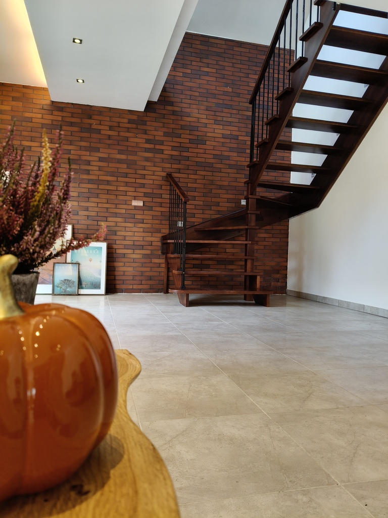 Na parterze położono płytki ceramiczne, a na piętrze – panele podłogowe.