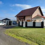 - front: ogrodzenie murowano–panelowe z szeroką bramą,
