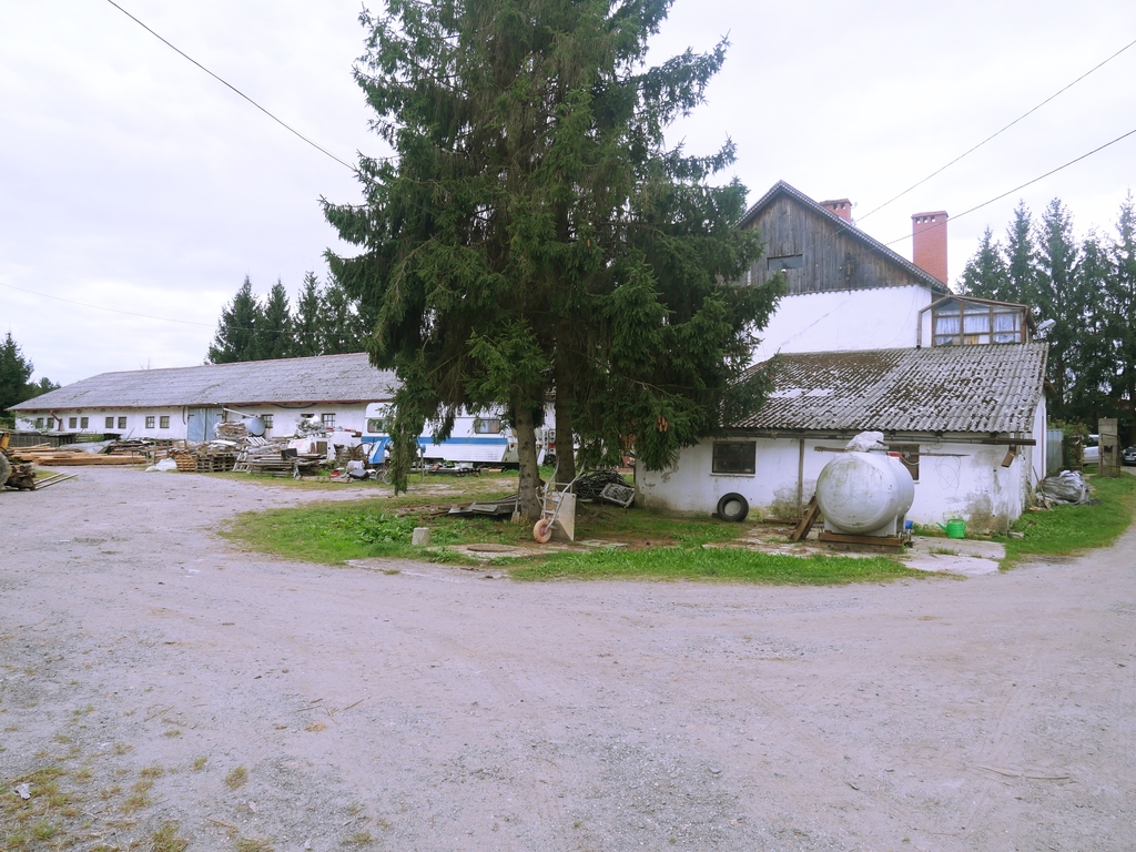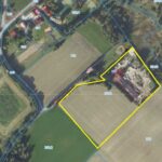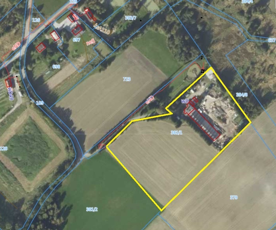 - Działka w części zabudowanej ogrodzona siatką z szeroką bramą wjazdową oraz 1 ha ziemi rolnej bezpośrednio przyległej do ogrodzenia.