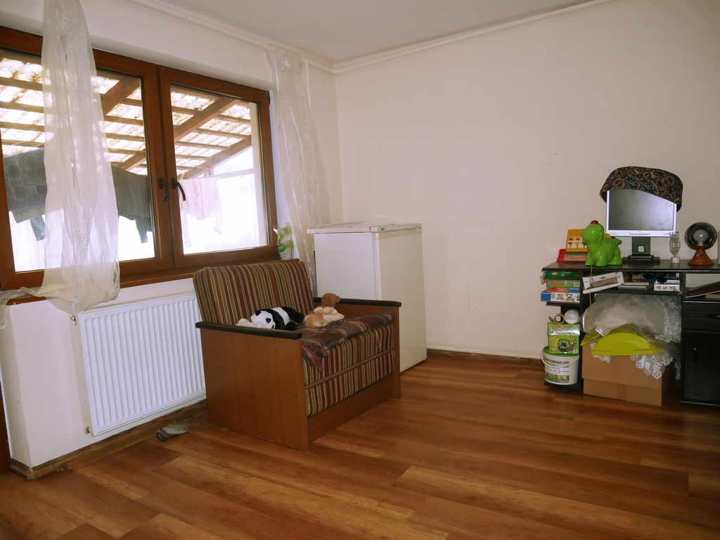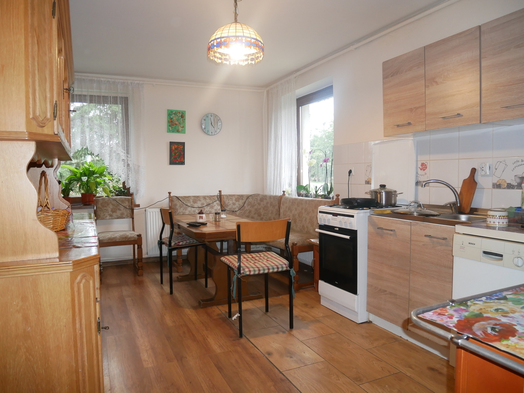 - Parter - wiatrołap, przestronny pokój dzienny (salon) z aneksem kuchennym, trzy pokoje, łazienka, kotłownia (piec na paliwo stałe), komórka.