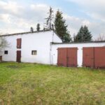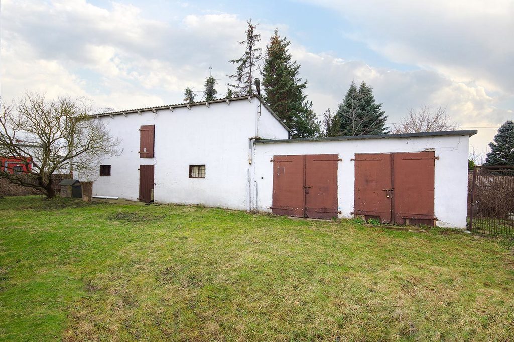 Działka płaska w trapezie o powierzchni: 619 m2 która jest zabudowana budynkiem gospodarczym z dwoma dodatkowymi garażami.