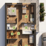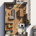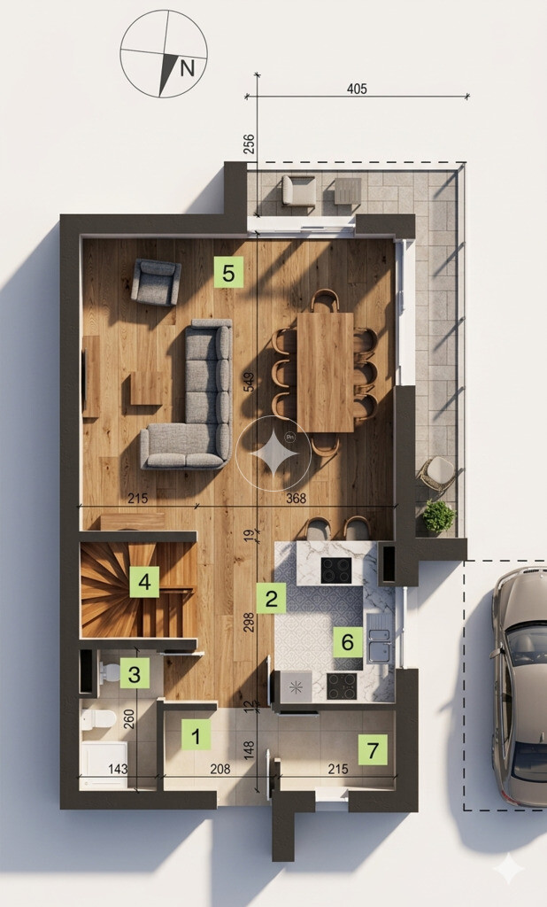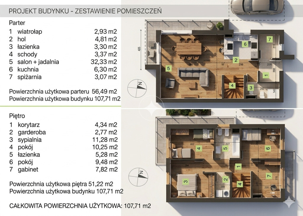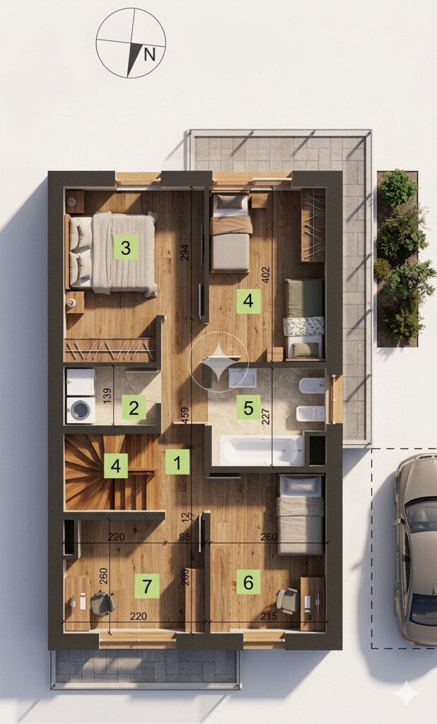 - Przestrzeń bez kompromisów: Do dyspozycji masz aż 5 ustawnych pokoi. Dzięki przemyślanemu projektowi (brak skosów!), powierzchnia użytkowa 107 m² (całkowita ok. 148 m²) daje Ci pełną swobodę aranżacji – idealne miejsce na domowe biuro, sypialnię czy pokój dla dzieci.