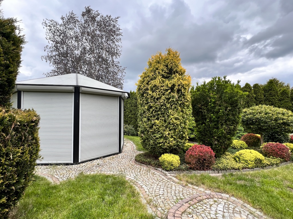 - w ogrodzie znajduje się altana, zadaszona poliwęglanem z automatycznie zamykanymi roletami, w ciepłe dni pełniąca funkcję wiaty ogrodowej, zimą jest schowkiem na meble ogrodowe;