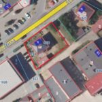 Działka o pow. 650 m2 w kształcie trapezu i wymiarach 27 m, 22 m, 31 m, 23 m.