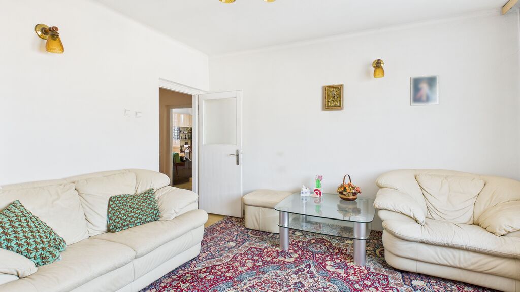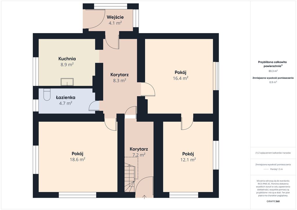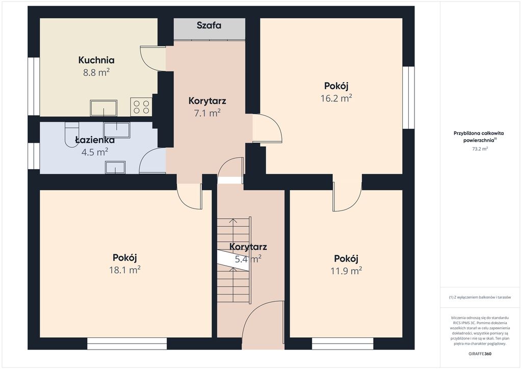 Piętro: kuchnia, łazienka, 3 pokoje, balkon,