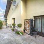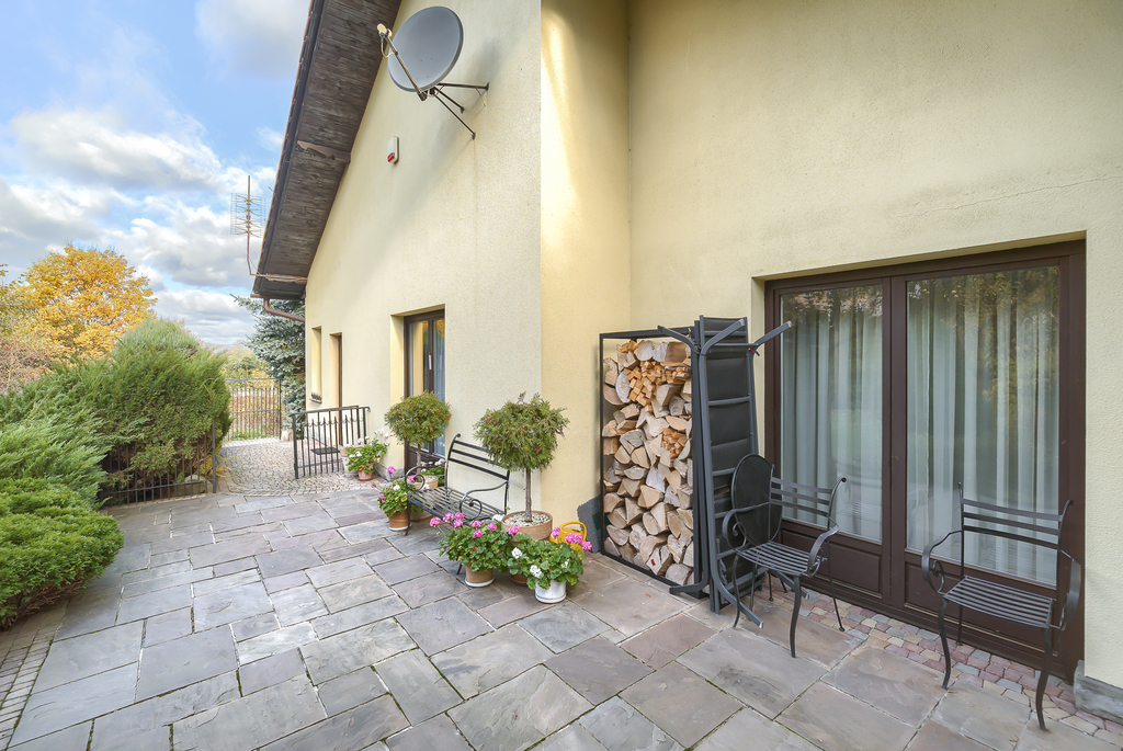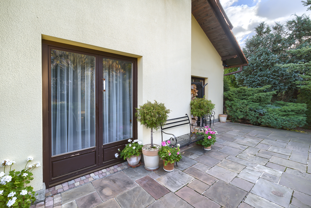 Taras z dwoma niezależnymi wejściami z jadalni oraz sypialni, z którego rozpościera się widok na zielony, pięknie zagospodarowany ogród.
