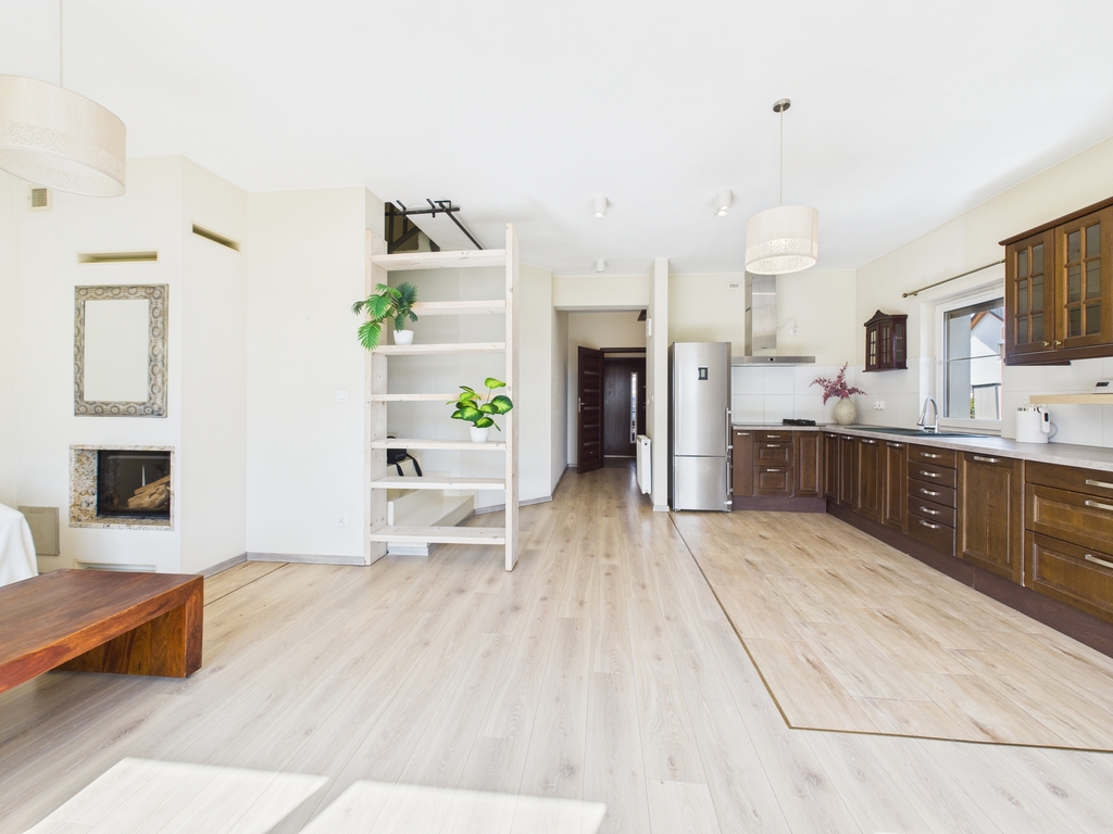 Wnętrze domu zostało zaprojektowane z myślą o wygodzie całej rodziny. Przestronny salon z kominkiem, widna kuchnia, aż 5 pokoi, garderoba oraz dwie oddzielne toalety – to idealne połączenie przestrzeni dziennej i prywatnej.