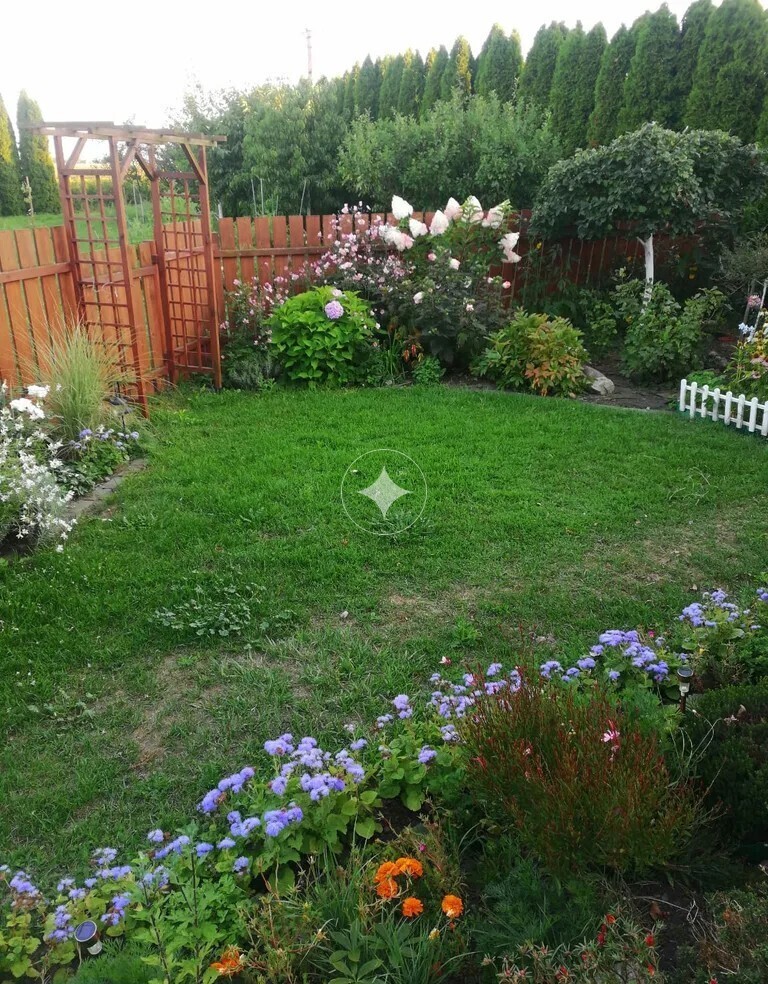 Działka została starannie zagospodarowana – znajdziemy tu liczne nasadzenia, drzewa owocowe oraz warzywnik. Całość otoczona jest wysoką zielenią, zapewniającą prywatność.