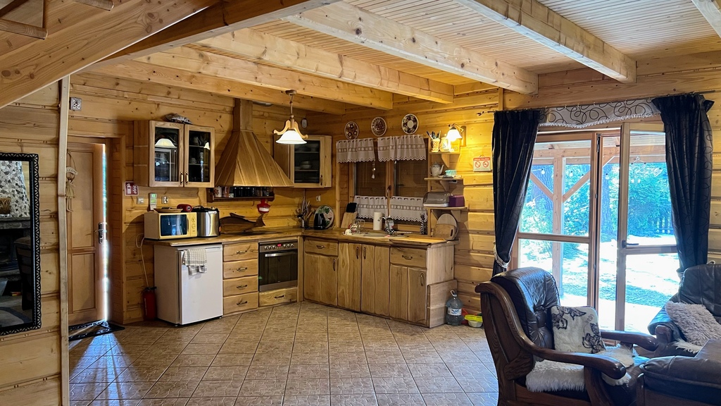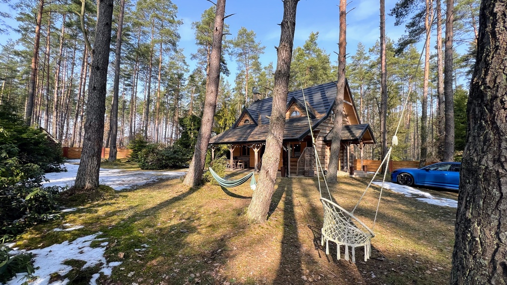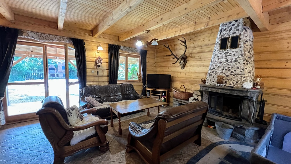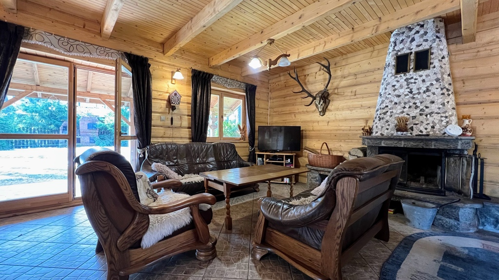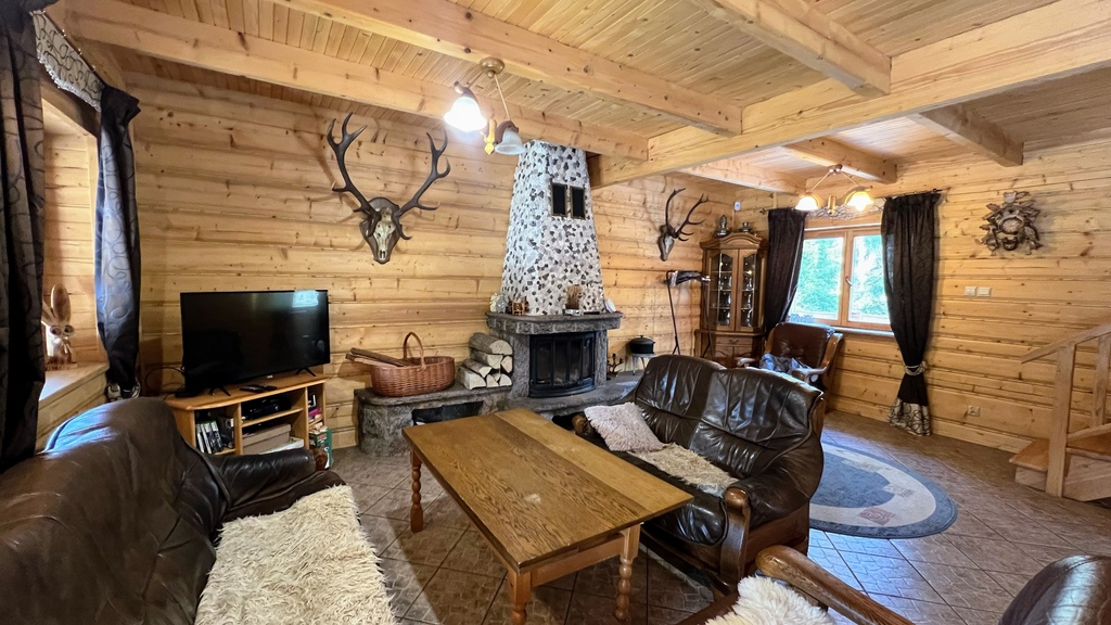 letniskowy dom z bala nawiązujące do góralskiego stylu, robiący klimat – idealny na wakacje, wynajem lub jako własna baza wypadowa przez cały rok. Nieruchomość znajduje się w spokojnej okolicy, zaledwie